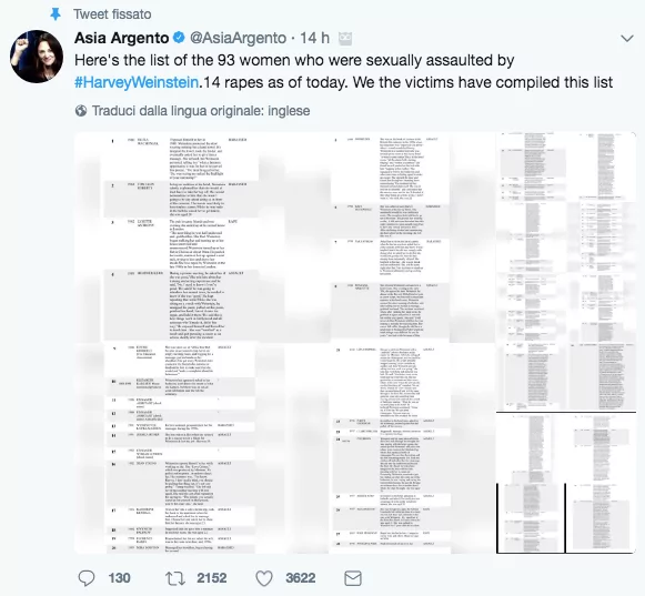 L’attrice ha condiviso la lista delle vittime di Harvey Weinstein sul suo profilo Twitter, fissando la notizia in alto sul social, a voler dare la giusta importanza prima di tutto alle vittime, le stesse, come scrive Asia Argento che hanno creato la lista. Sul social l’attrice italiana, scrive un post in inglese unitamente alla lettera condivisa: “Ecco l’elenco delle 93 donne che sono state assalite sessualmente da #HarveyWeinstein. 14 stupri da oggi. Le vittime hanno compilato questa lista”.