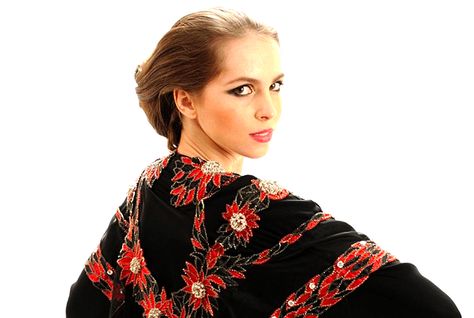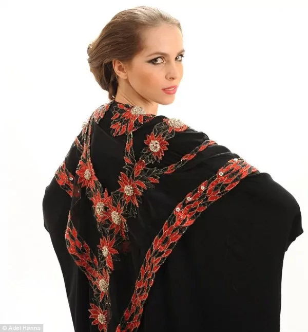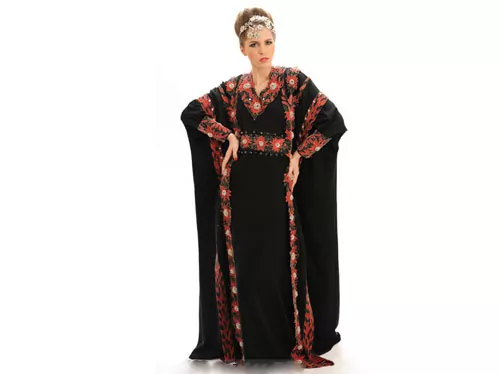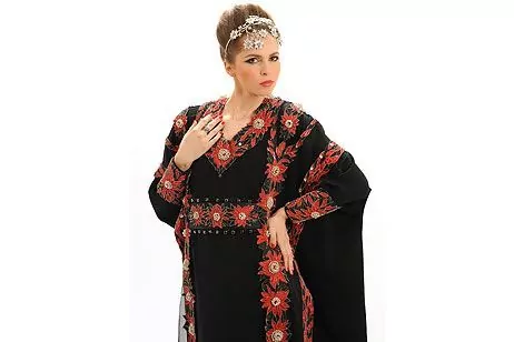 L’abito, chiamato Abaya, è ricoperto da oltre 2000 pietre preziose tra cui 50 diamanti bianchi a 2 carati ed un diamante rosso tra i più costosi e rari, posizionato al centro del caftano.