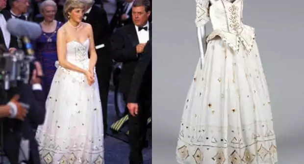 E’ un abito da sera che la principessa Lady Diana aveva indossato diverse volte: a un banchetto nella residenza dell’ambasciatore tedesco a Londra, nel 1986, alla prima del film di James Bond “The Living Daylights”, a Londra nel 1987. E’ stato venduto all’asta per 122mila euro e verrà esposto in un museo. E’ un bellissimo abito elegante, bianco, senza spalline e decorato con perle, paillettes dorate e cristalli.”Il vestito è opulento e stravagante. Come ogni ragazza immagina un vestito da principessa” e, ha dichiarato Kerry Taylor il proprietario della Kerry Taylor Auctions, è “romantico, come da fiaba“.