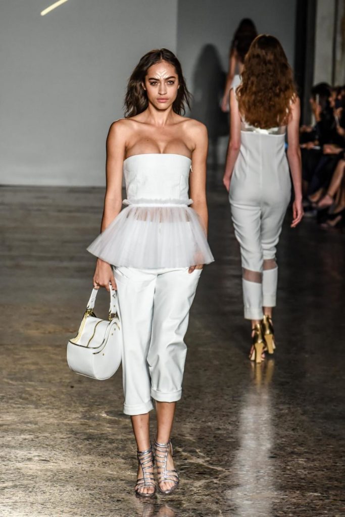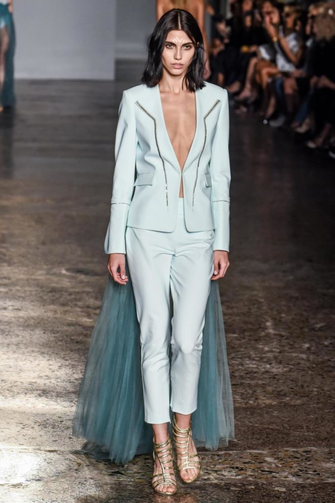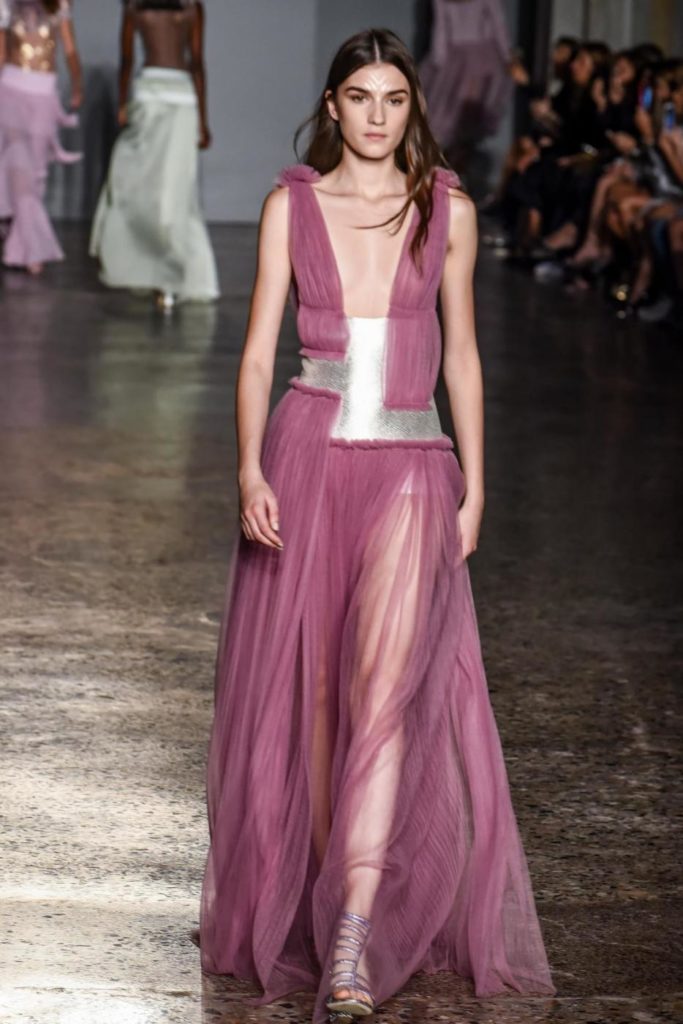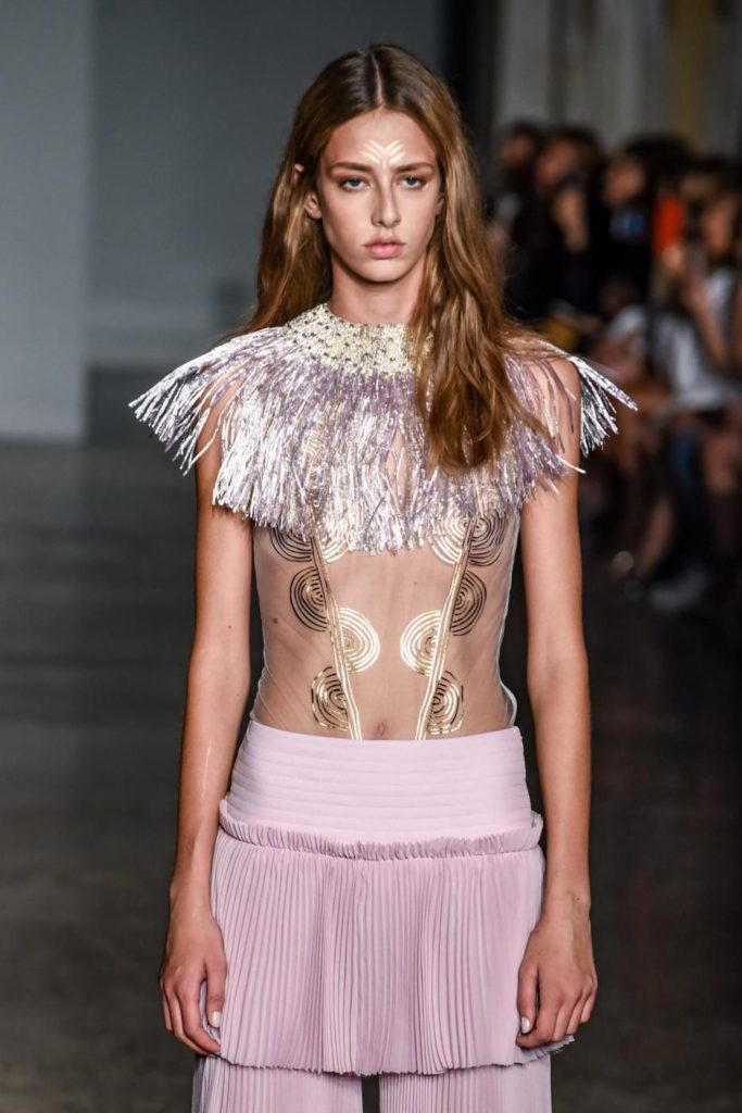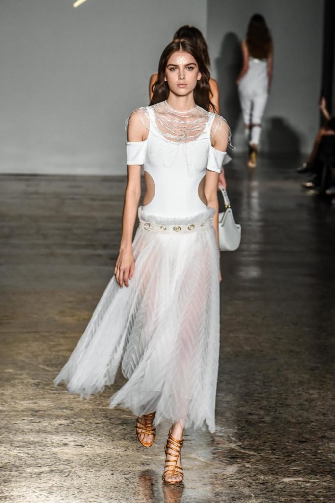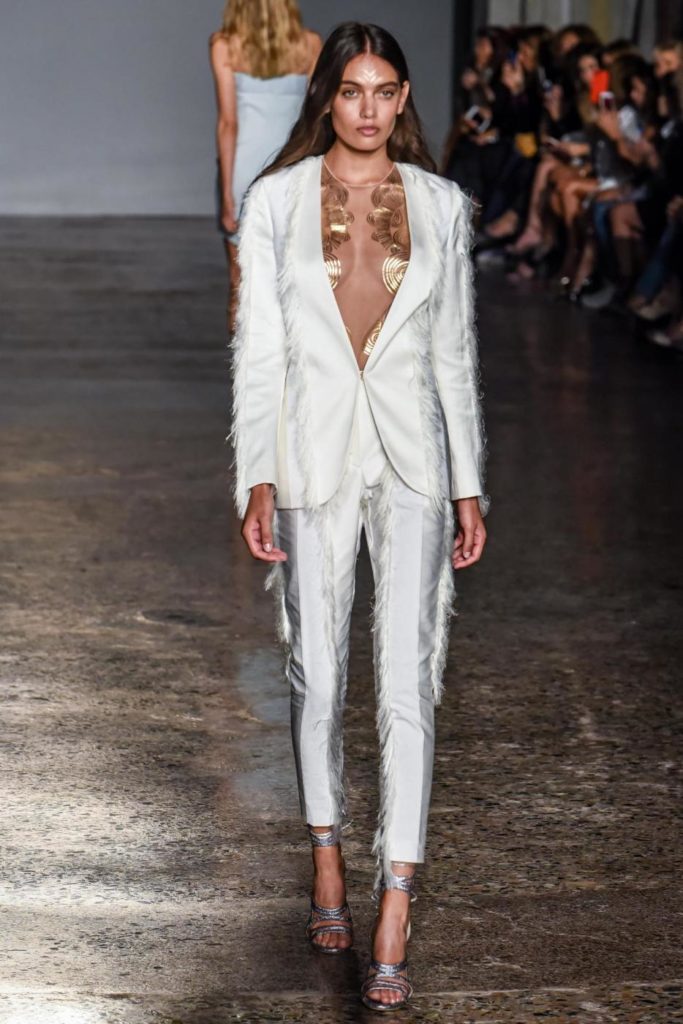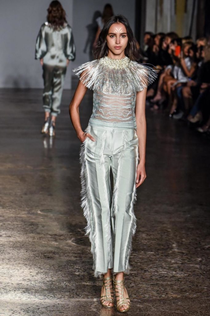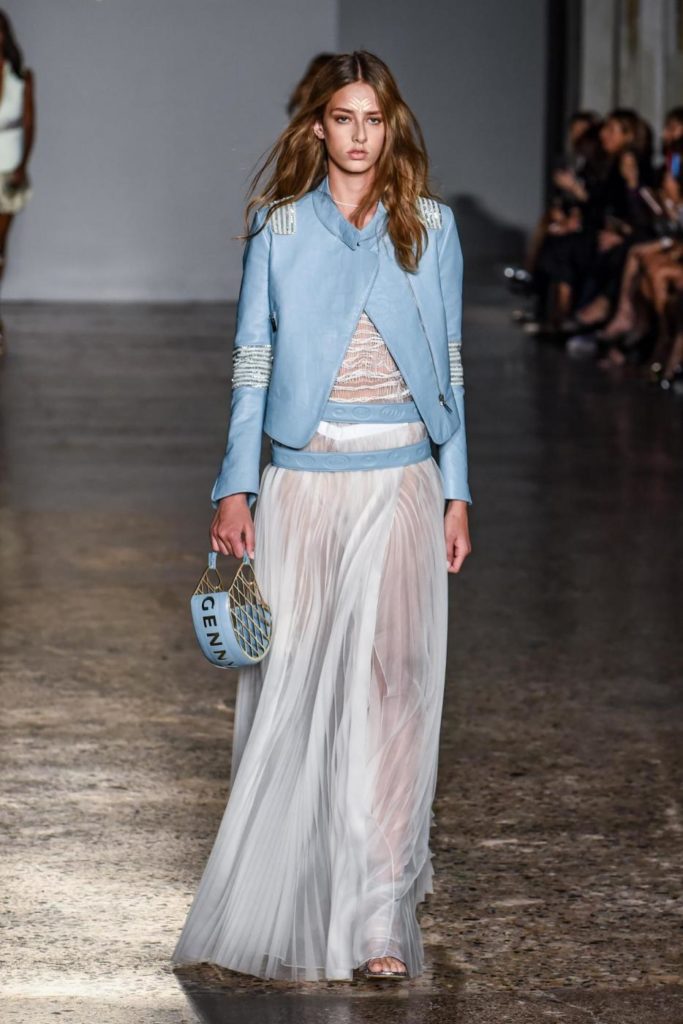 i top in maglieria compatta sono indossati con gonne salopette in organza plisse’; le camicie in tulle si abbinano a cargo pant in pelle e i pantaloni a sigaretta sono indossati con giacche arricchite da ricami in paillette e inserti plisse’ che creano un effetto mantella. I motivi grafici di ispirazione tribale sono protagonisti nella collezione come stampe ma anche in versione jacquard o come ricami di micro perline negli abiti da sera con dettagli in seta drappeggiata. Le borse in pelle e metallo nascono dall’inspirazione al mondo automobilistico che si evidenzia nella collezione e richiamano le forme del casco e della borraccia. A distinguersi nella collezione anche tre capi particolari: una jumpsuit, un mini abito e un maxi dress in seta bianca biologica, che la stilista Sara Cavazza Facchini spiega così: “come segno di attenzione per l’ambiente e le condizioni di lavoro”. Ispirazioni chiare e decise unite a messaggi di spessore dunque per la nuova collezione Genny pensata per la primavera estate 2018, che fa della mescolanza tra mondo automobilistico e influenze del deserto il mood della sua sfilata.