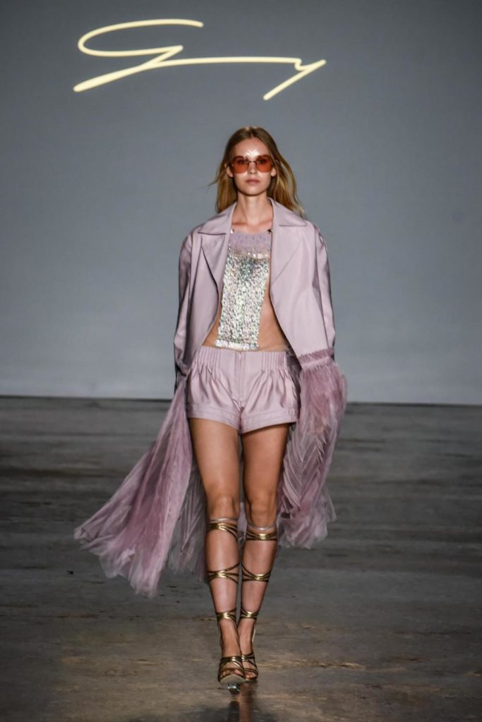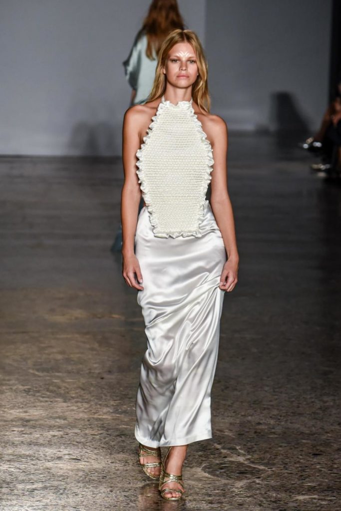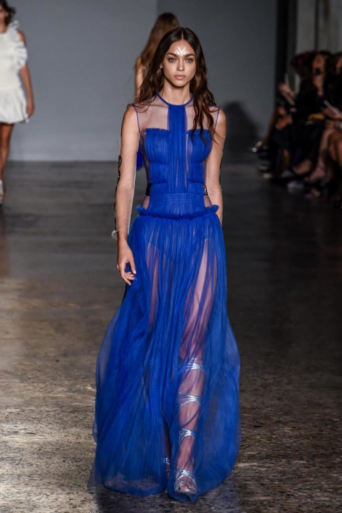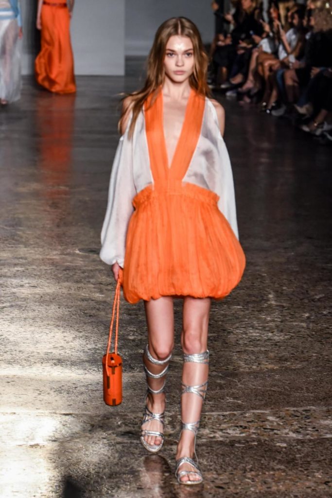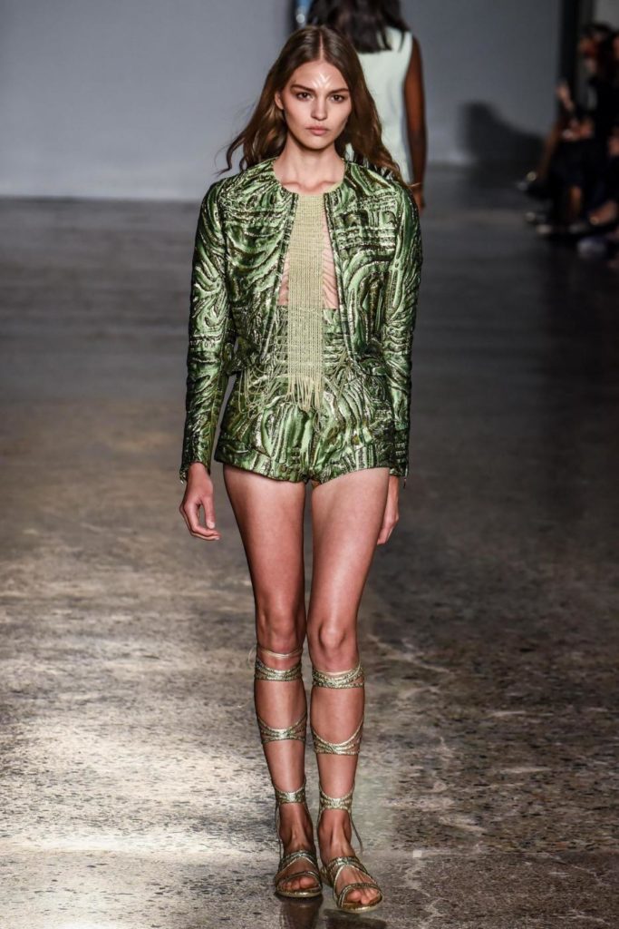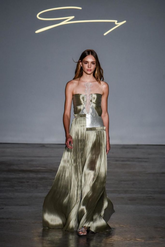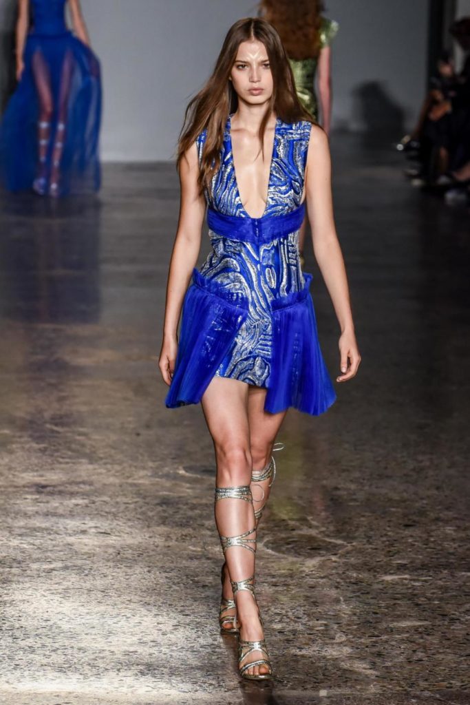 i top in maglieria compatta sono indossati con gonne salopette in organza plisse’; le camicie in tulle si abbinano a cargo pant in pelle e i pantaloni a sigaretta sono indossati con giacche arricchite da ricami in paillette e inserti plisse’ che creano un effetto mantella. I motivi grafici di ispirazione tribale sono protagonisti nella collezione come stampe ma anche in versione jacquard o come ricami di micro perline negli abiti da sera con dettagli in seta drappeggiata. Le borse in pelle e metallo nascono dall’inspirazione al mondo automobilistico che si evidenzia nella collezione e richiamano le forme del casco e della borraccia. A distinguersi nella collezione anche tre capi particolari: una jumpsuit, un mini abito e un maxi dress in seta bianca biologica, che la stilista Sara Cavazza Facchini spiega così: “come segno di attenzione per l’ambiente e le condizioni di lavoro”. Ispirazioni chiare e decise unite a messaggi di spessore dunque per la nuova collezione Genny pensata per la primavera estate 2018, che fa della mescolanza tra mondo automobilistico e influenze del deserto il mood della sua sfilata.