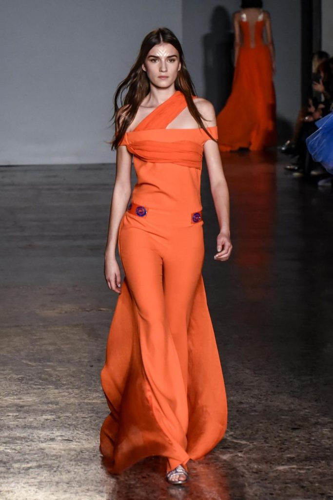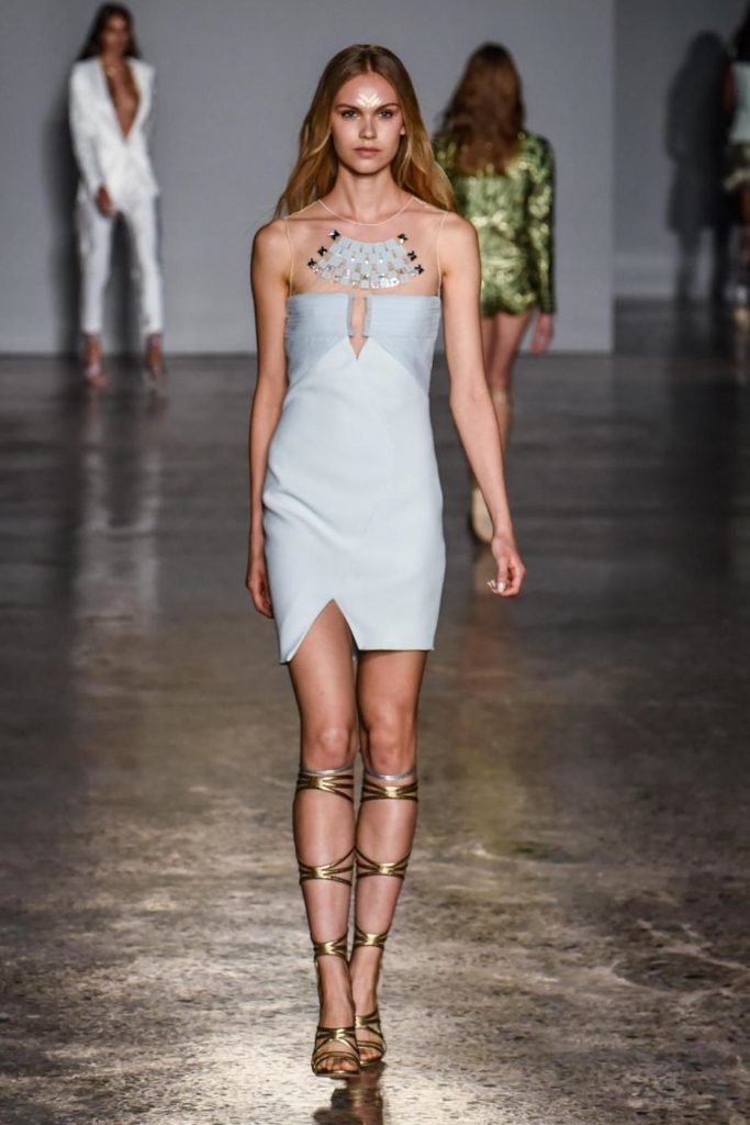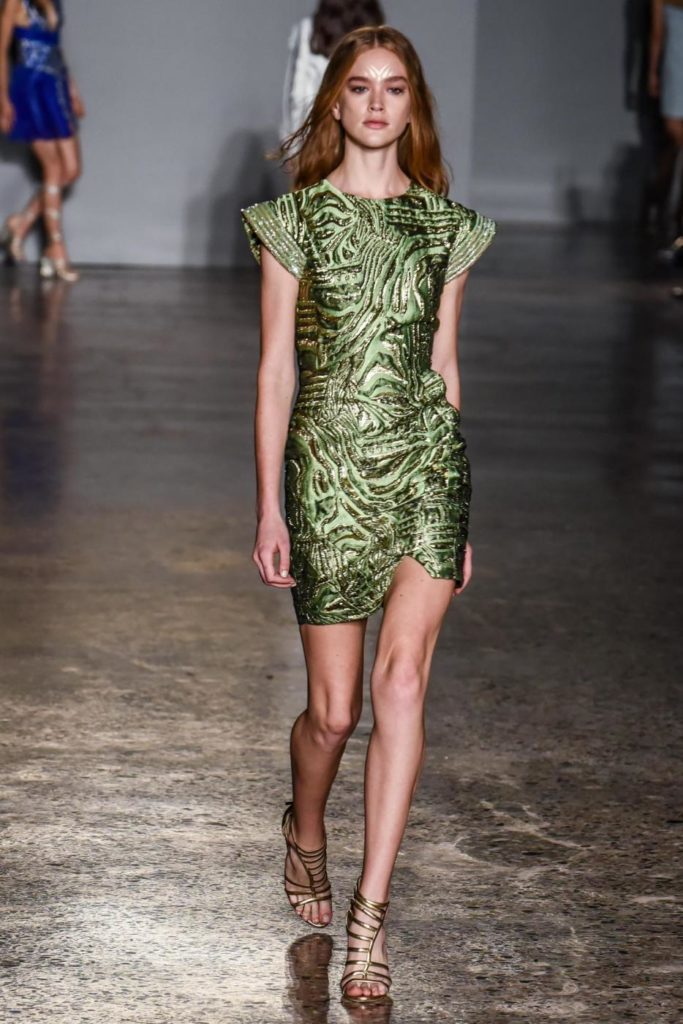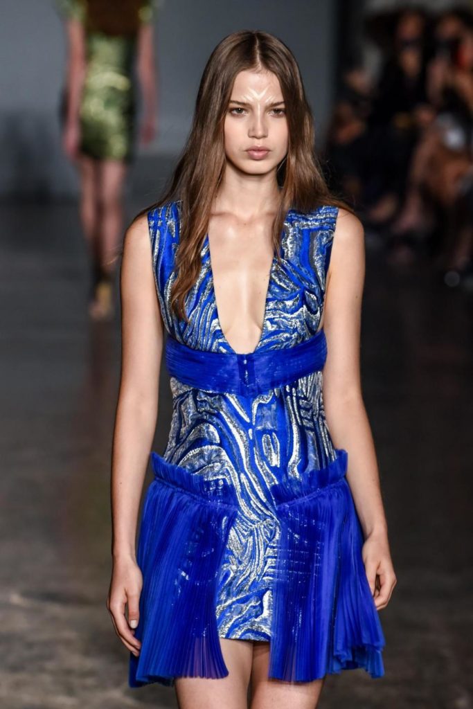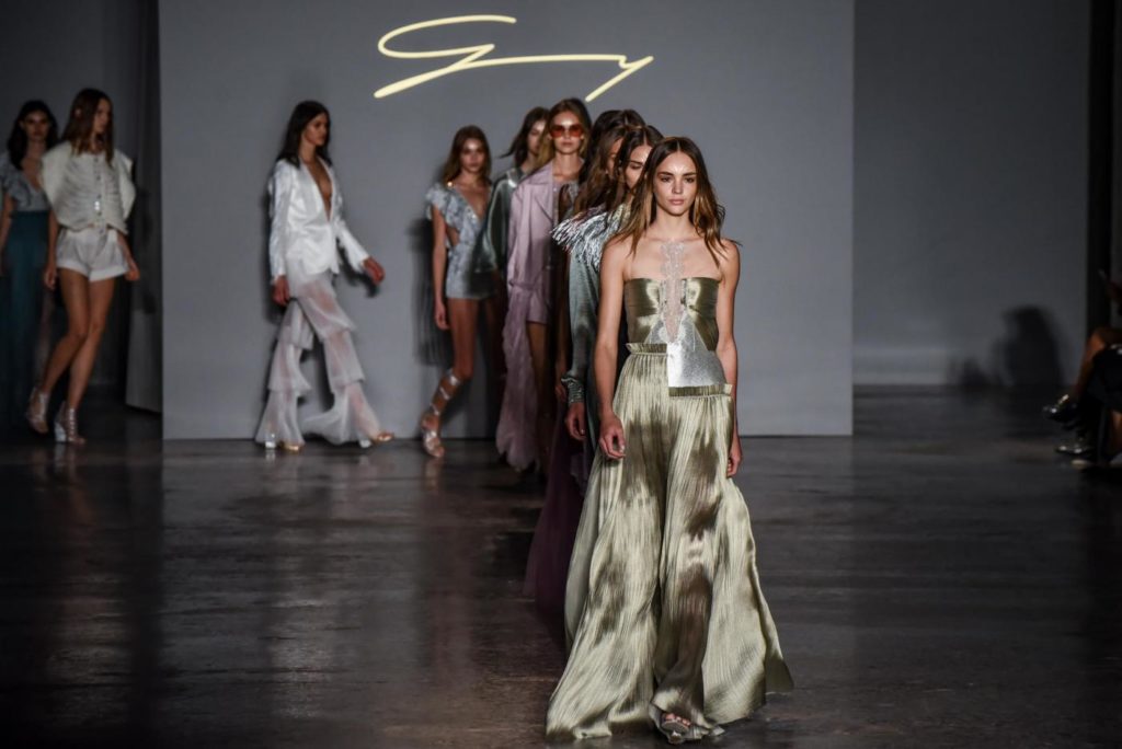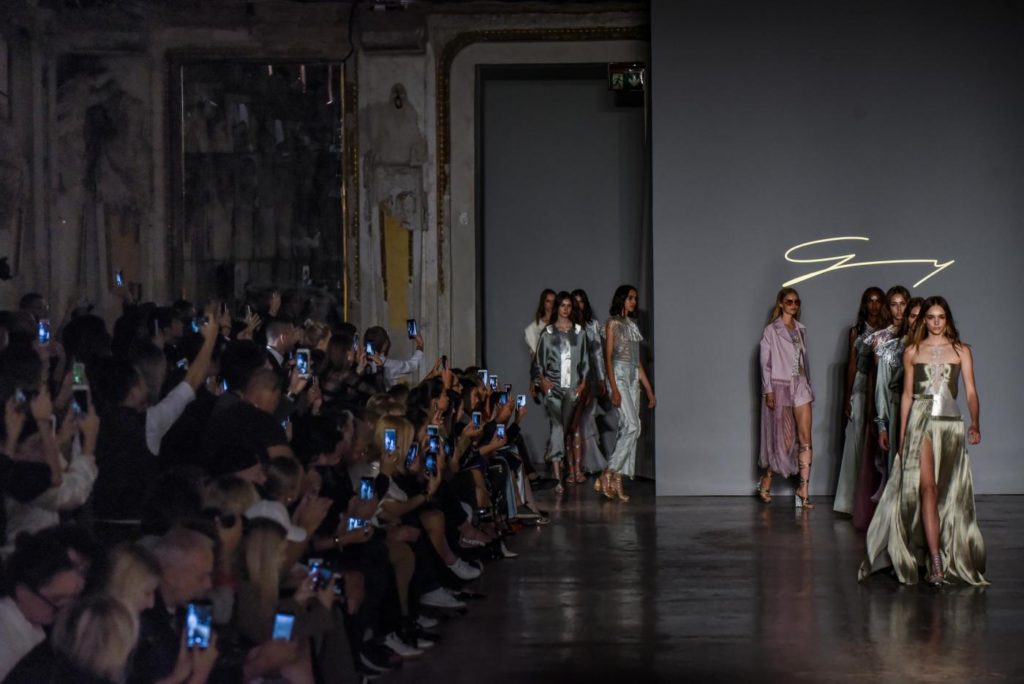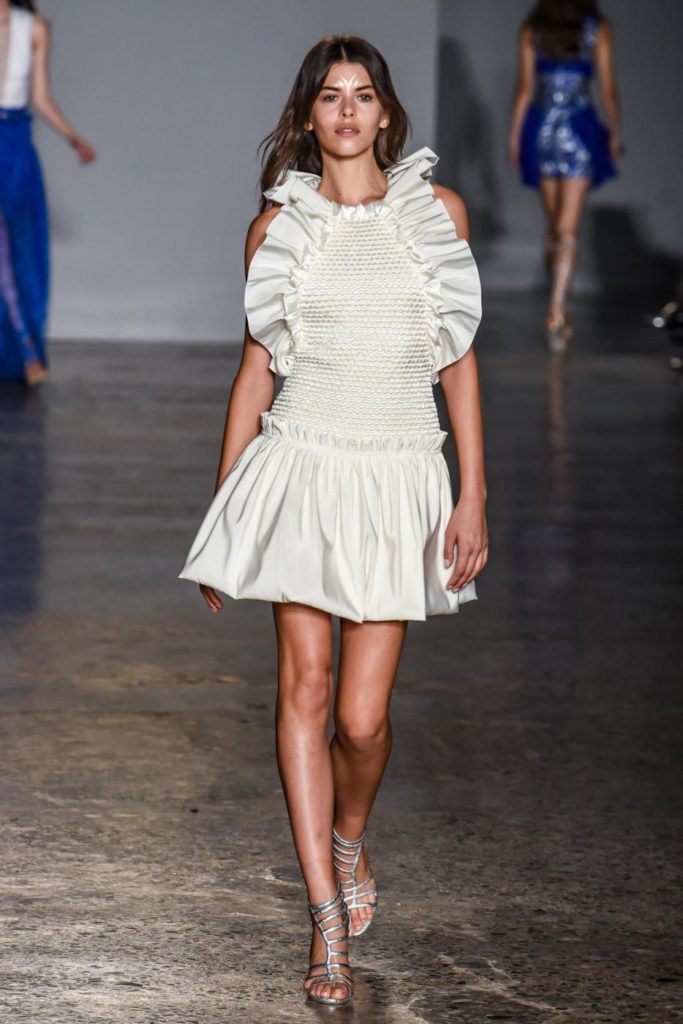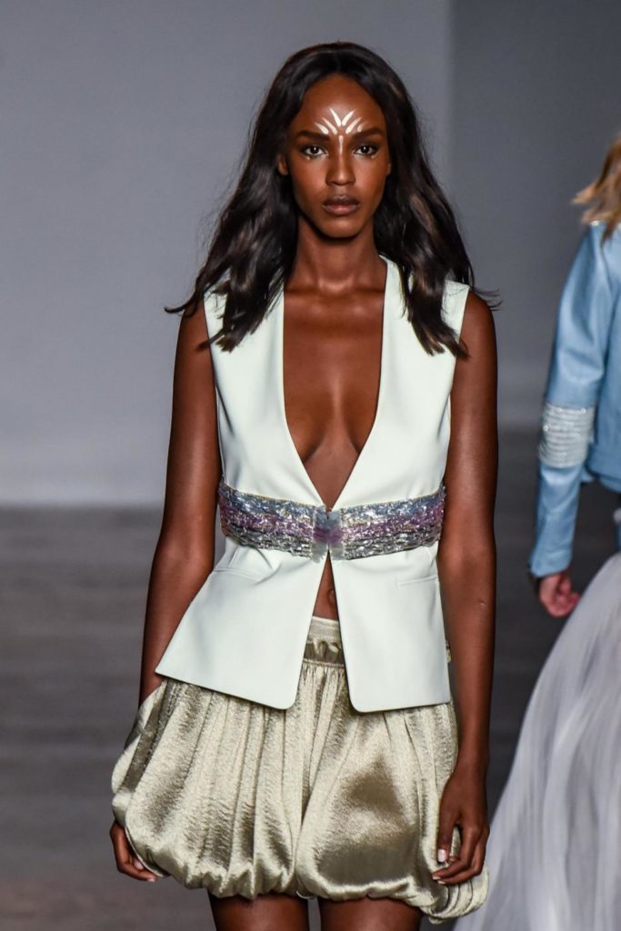 i top in maglieria compatta sono indossati con gonne salopette in organza plisse’; le camicie in tulle si abbinano a cargo pant in pelle e i pantaloni a sigaretta sono indossati con giacche arricchite da ricami in paillette e inserti plisse’ che creano un effetto mantella. I motivi grafici di ispirazione tribale sono protagonisti nella collezione come stampe ma anche in versione jacquard o come ricami di micro perline negli abiti da sera con dettagli in seta drappeggiata. Le borse in pelle e metallo nascono dall’inspirazione al mondo automobilistico che si evidenzia nella collezione e richiamano le forme del casco e della borraccia. A distinguersi nella collezione anche tre capi particolari: una jumpsuit, un mini abito e un maxi dress in seta bianca biologica, che la stilista Sara Cavazza Facchini spiega così: “come segno di attenzione per l’ambiente e le condizioni di lavoro”. Ispirazioni chiare e decise unite a messaggi di spessore dunque per la nuova collezione Genny pensata per la primavera estate 2018, che fa della mescolanza tra mondo automobilistico e influenze del deserto il mood della sua sfilata.
