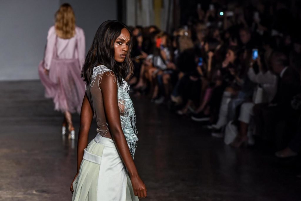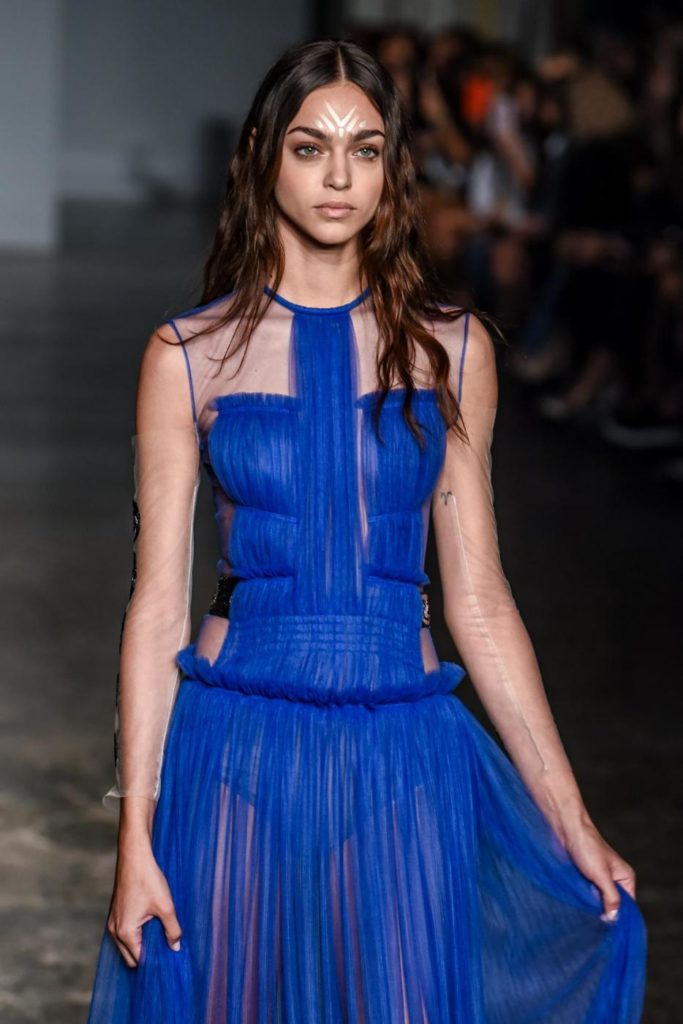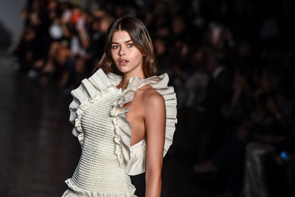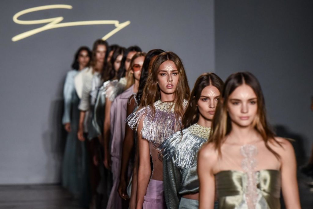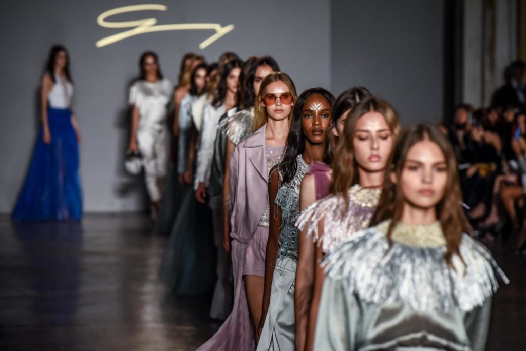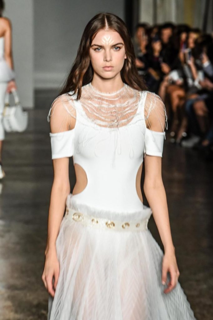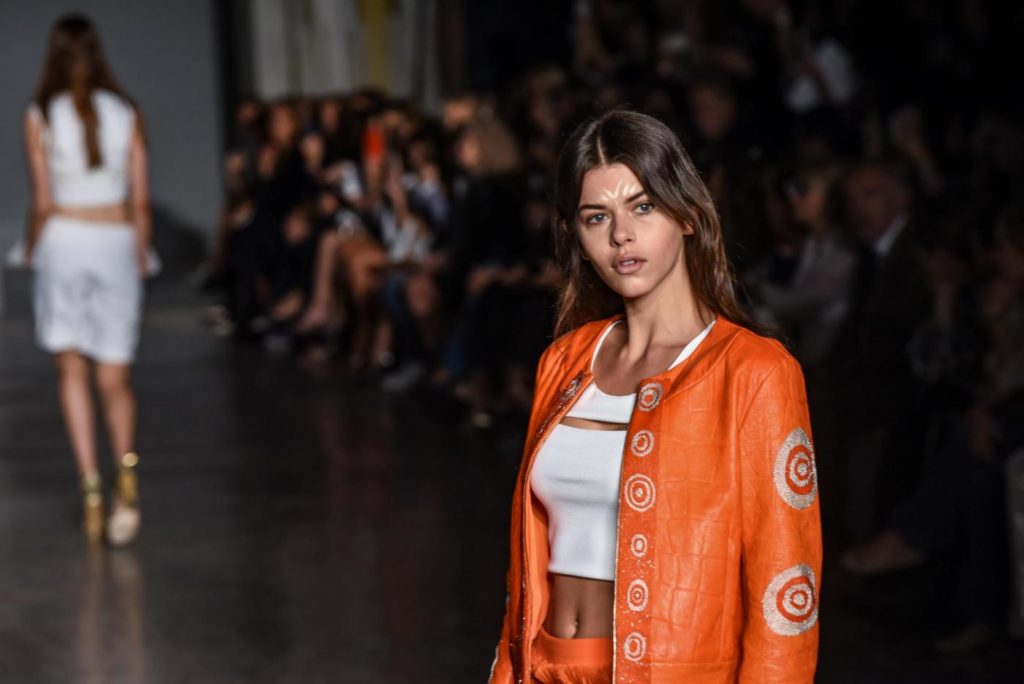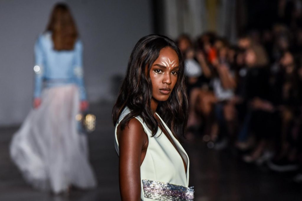 i top in maglieria compatta sono indossati con gonne salopette in organza plisse’; le camicie in tulle si abbinano a cargo pant in pelle e i pantaloni a sigaretta sono indossati con giacche arricchite da ricami in paillette e inserti plisse’ che creano un effetto mantella. I motivi grafici di ispirazione tribale sono protagonisti nella collezione come stampe ma anche in versione jacquard o come ricami di micro perline negli abiti da sera con dettagli in seta drappeggiata. Le borse in pelle e metallo nascono dall’inspirazione al mondo automobilistico che si evidenzia nella collezione e richiamano le forme del casco e della borraccia. A distinguersi nella collezione anche tre capi particolari: una jumpsuit, un mini abito e un maxi dress in seta bianca biologica, che la stilista Sara Cavazza Facchini spiega così: “come segno di attenzione per l’ambiente e le condizioni di lavoro”. Ispirazioni chiare e decise unite a messaggi di spessore dunque per la nuova collezione Genny pensata per la primavera estate 2018, che fa della mescolanza tra mondo automobilistico e influenze del deserto il mood della sua sfilata.