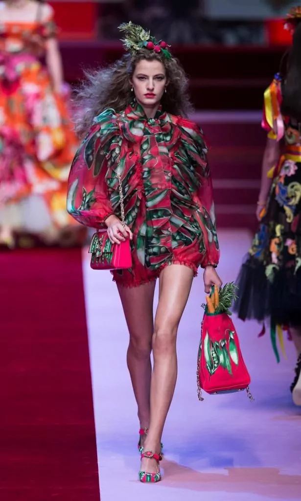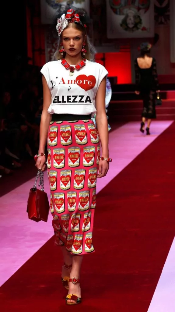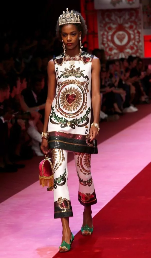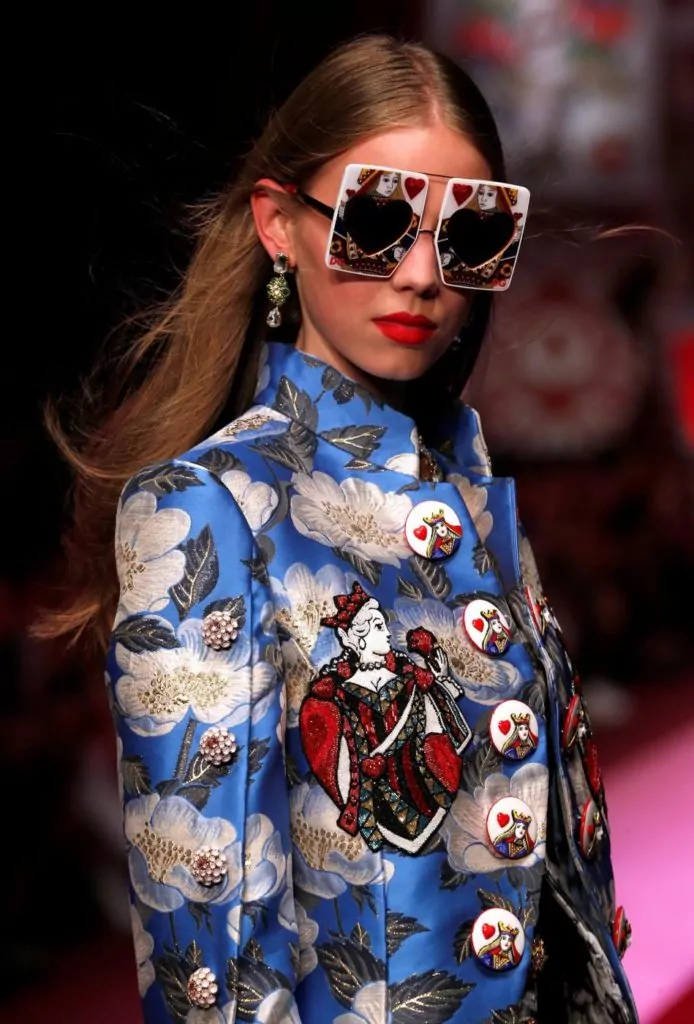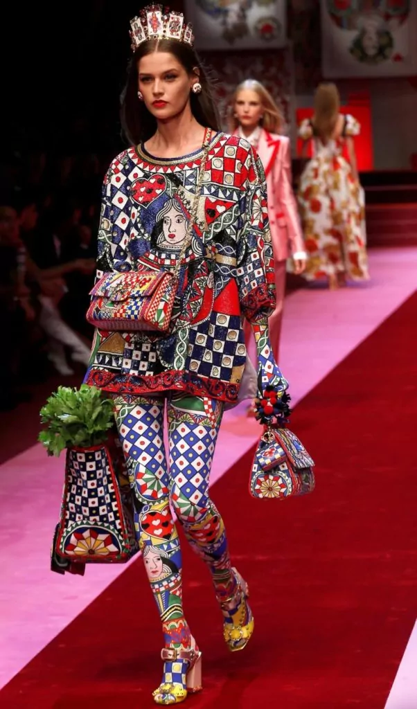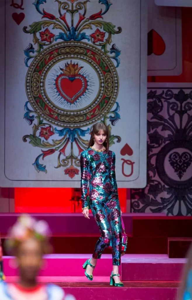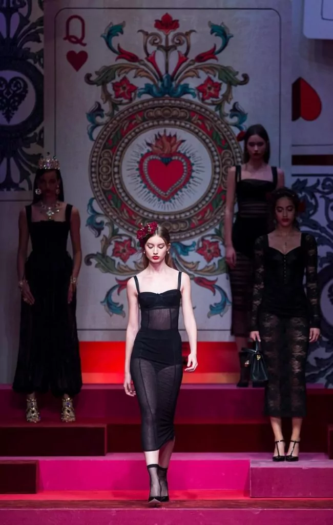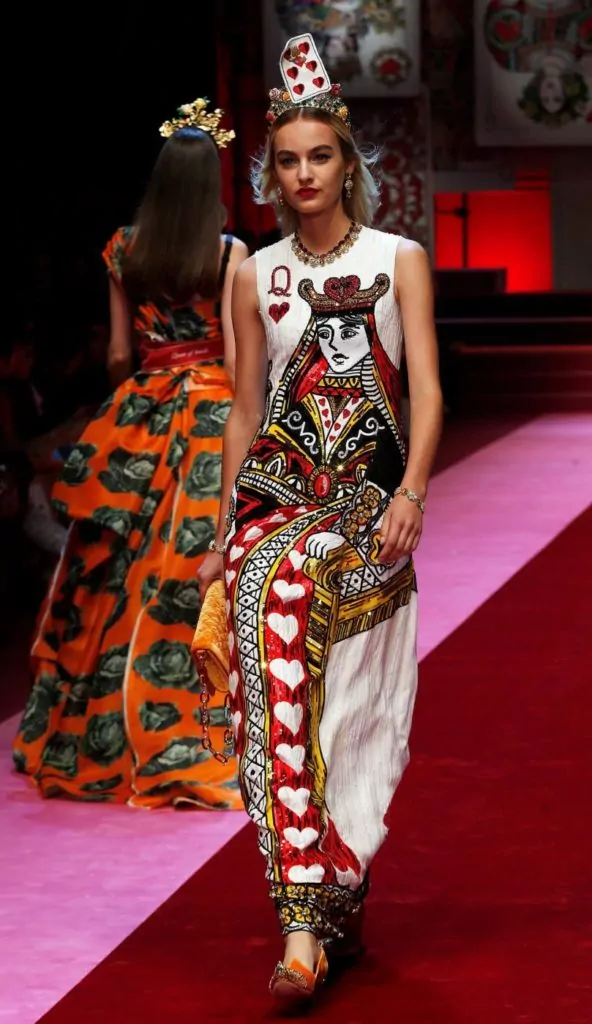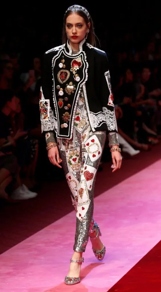 La collezione per la primavera estate 2018 ha sfilato tra colori sgargianti, decorazioni floreali che hanno adornato le teste delle modelle attraverso coroncine di rose rosse, t-shirt con stampe e un’ispirazione ben chiara che si evince dagli abiti e si ritrova essenzialmente in due temi: l’essere regine e la bellezza, catalizzati nel forte veicolo simbolico della Regina di Cuori che si vede attraverso la trasposizione delle carte da gioco che la raffigurano su abiti, giacche, completi composti da giacca e pantalone, ma anche sulle teste con accessori a tema. Ma in passerella spiccano anche abiti neri, con pizzi e trasparenze, altro must have anche per gli outfit della prossima stagione, che fanno della sensualità la loro essenza tra bustini e longuette che faciano il corpo dando risalto ad ogni forma.