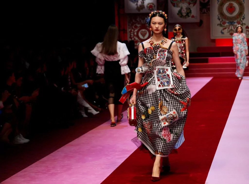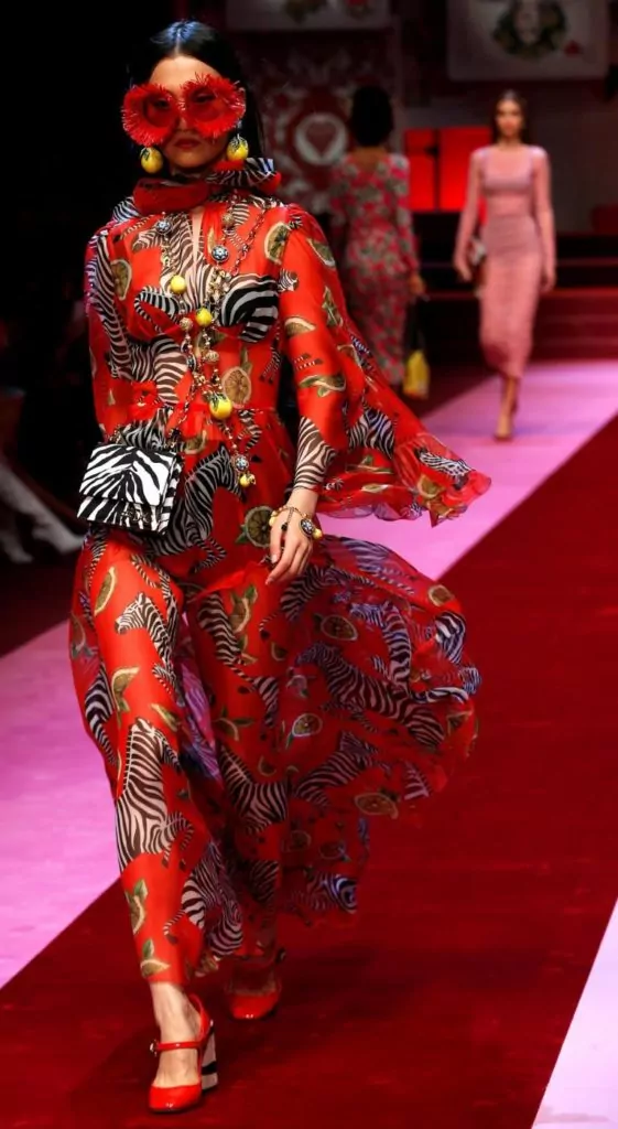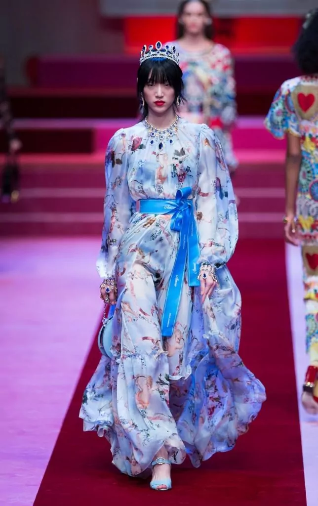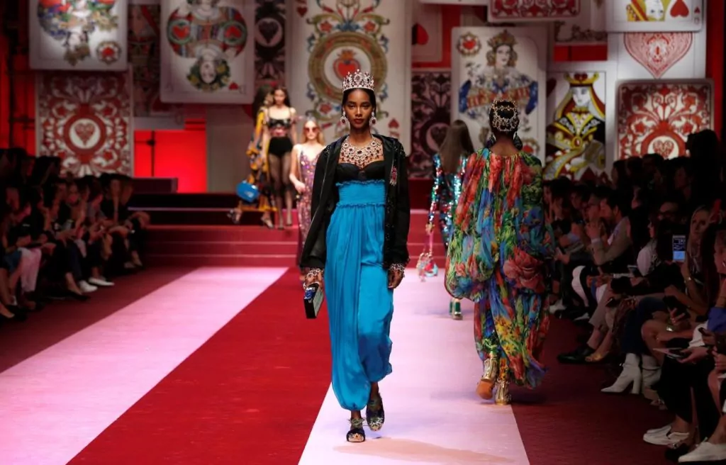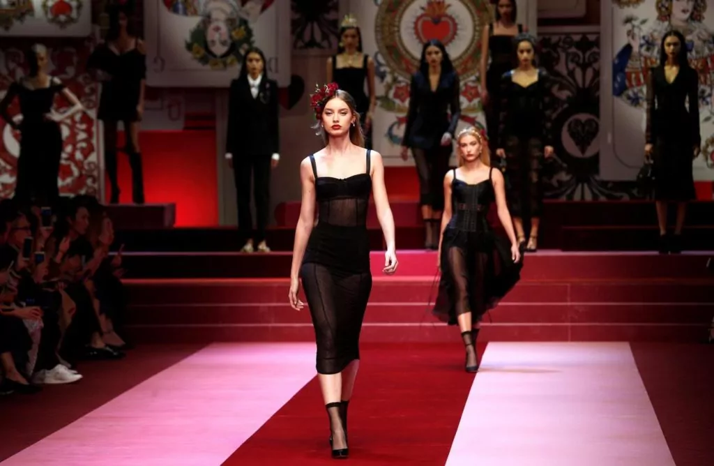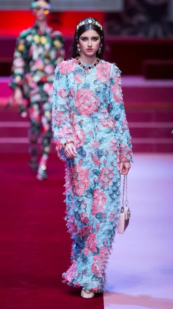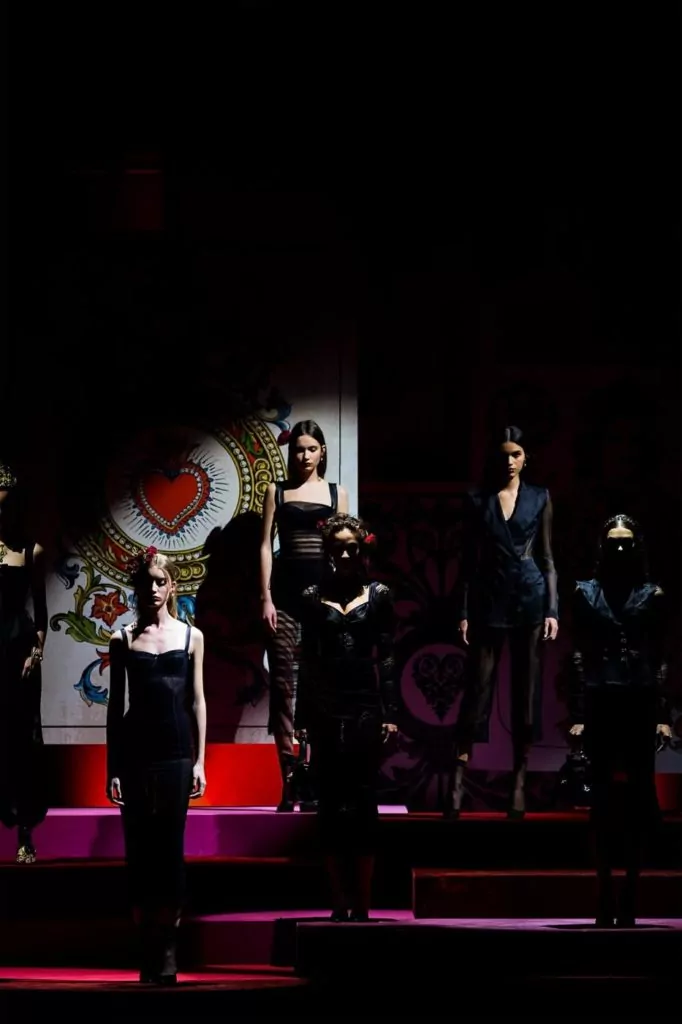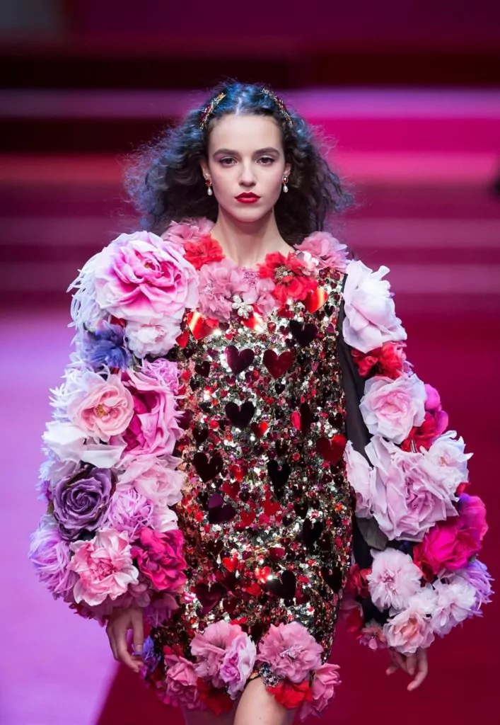 La collezione per la primavera estate 2018 ha sfilato tra colori sgargianti, decorazioni floreali che hanno adornato le teste delle modelle attraverso coroncine di rose rosse, t-shirt con stampe e un’ispirazione ben chiara che si evince dagli abiti e si ritrova essenzialmente in due temi: l’essere regine e la bellezza, catalizzati nel forte veicolo simbolico della Regina di Cuori che si vede attraverso la trasposizione delle carte da gioco che la raffigurano su abiti, giacche, completi composti da giacca e pantalone, ma anche sulle teste con accessori a tema. Ma in passerella spiccano anche abiti neri, con pizzi e trasparenze, altro must have anche per gli outfit della prossima stagione, che fanno della sensualità la loro essenza tra bustini e longuette che faciano il corpo dando risalto ad ogni forma.
