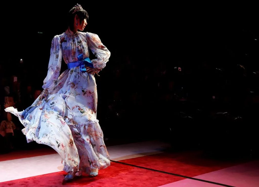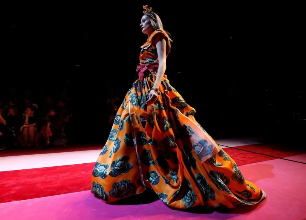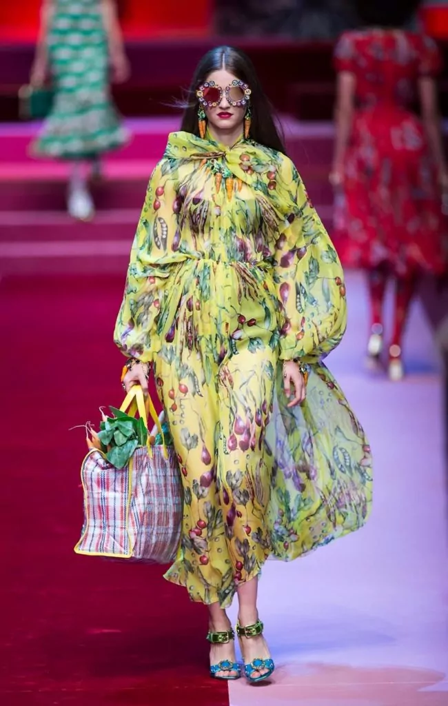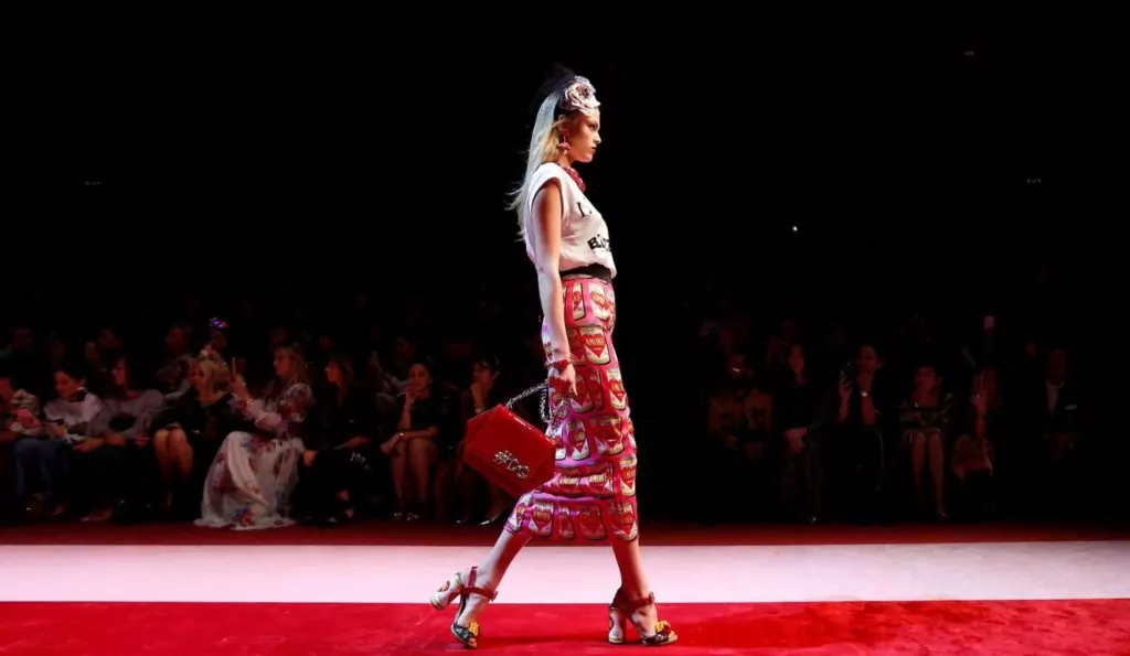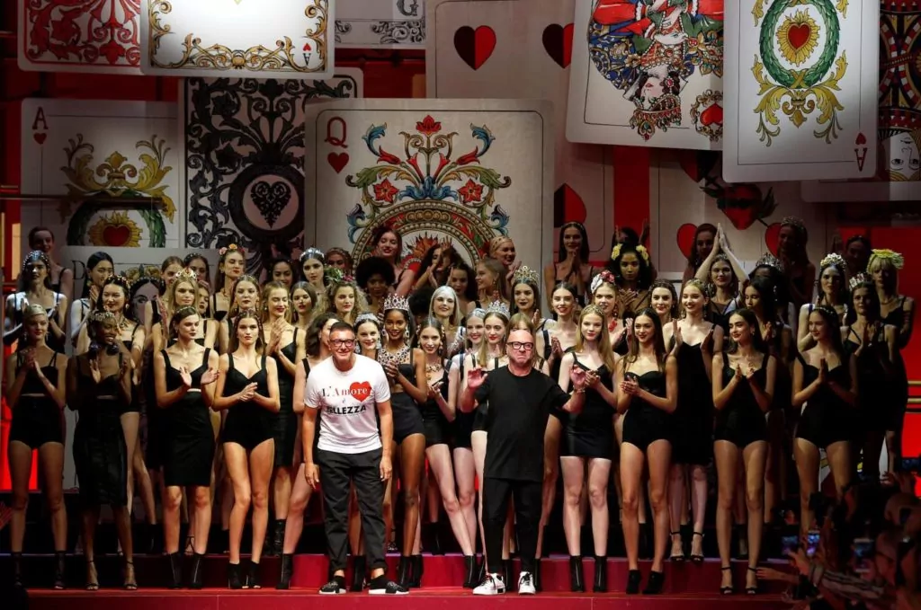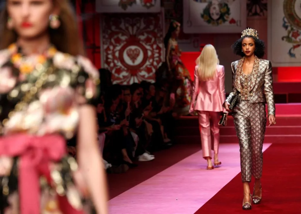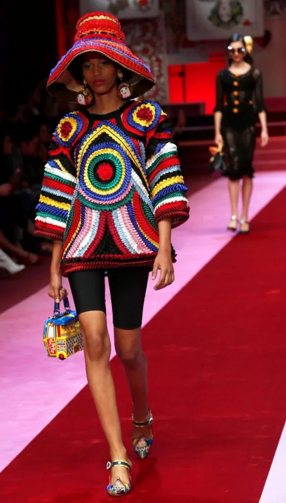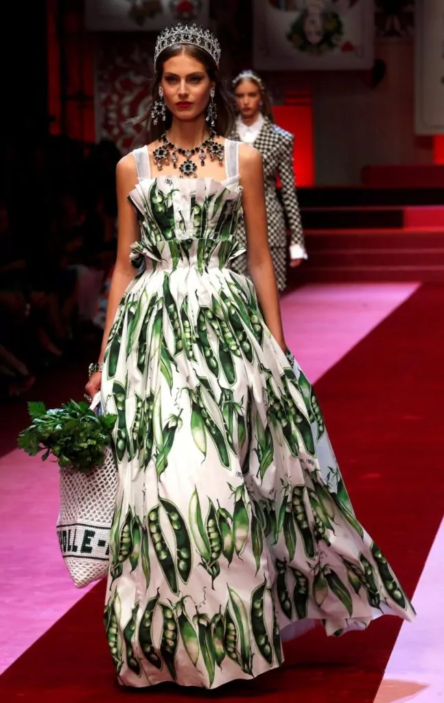 La collezione per la primavera estate 2018 ha sfilato tra colori sgargianti, decorazioni floreali che hanno adornato le teste delle modelle attraverso coroncine di rose rosse, t-shirt con stampe e un’ispirazione ben chiara che si evince dagli abiti e si ritrova essenzialmente in due temi: l’essere regine e la bellezza, catalizzati nel forte veicolo simbolico della Regina di Cuori che si vede attraverso la trasposizione delle carte da gioco che la raffigurano su abiti, giacche, completi composti da giacca e pantalone, ma anche sulle teste con accessori a tema. Ma in passerella spiccano anche abiti neri, con pizzi e trasparenze, altro must have anche per gli outfit della prossima stagione, che fanno della sensualità la loro essenza tra bustini e longuette che faciano il corpo dando risalto ad ogni forma.