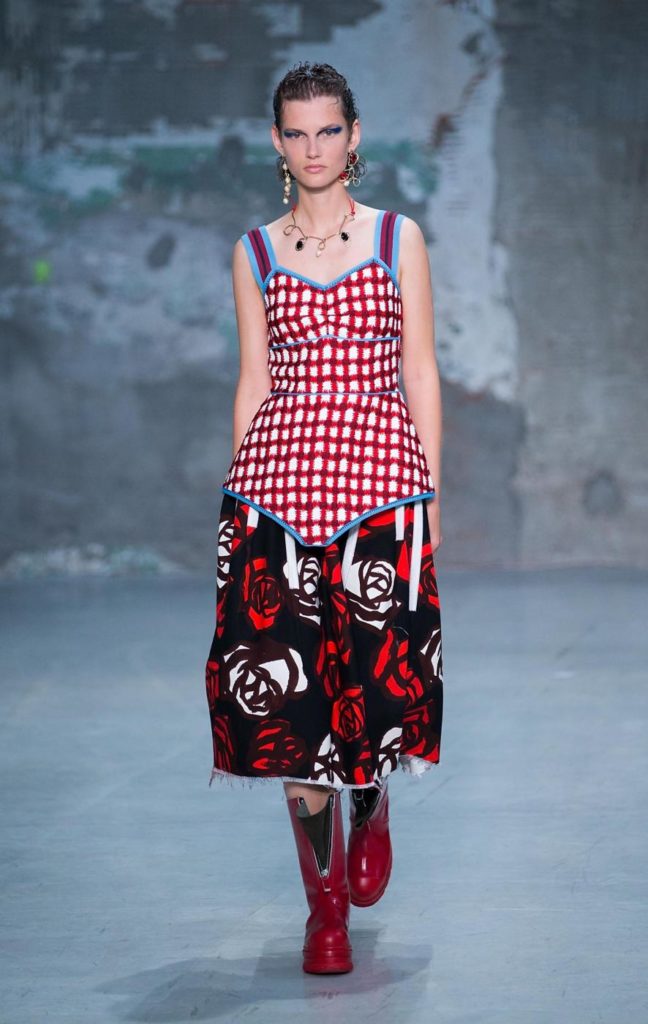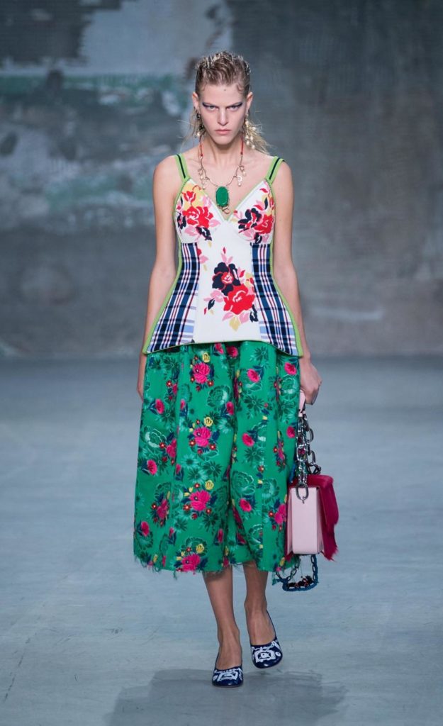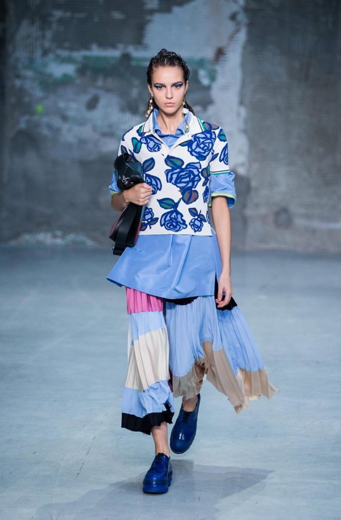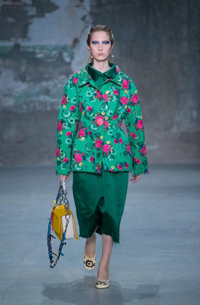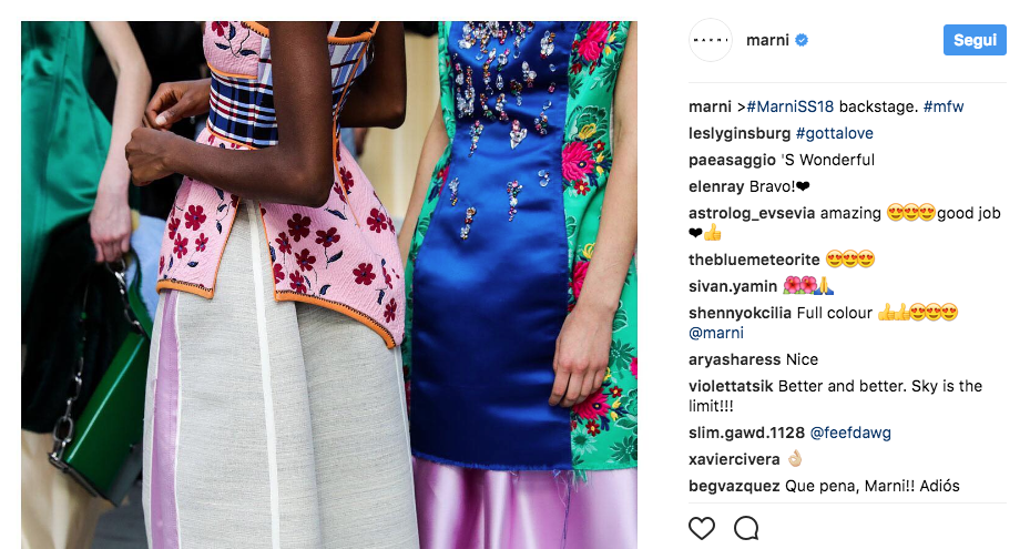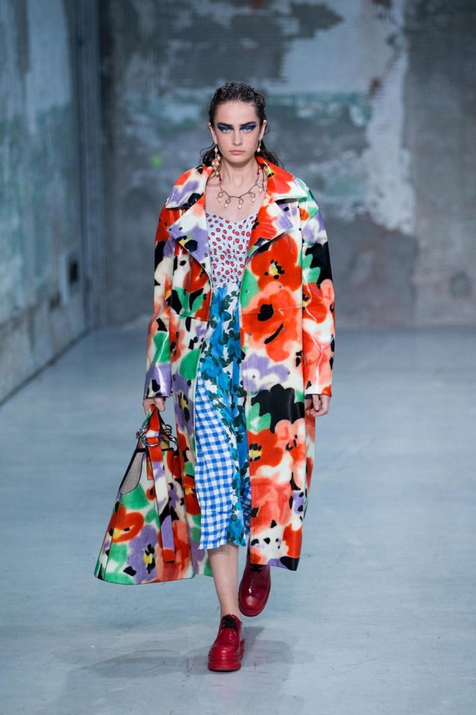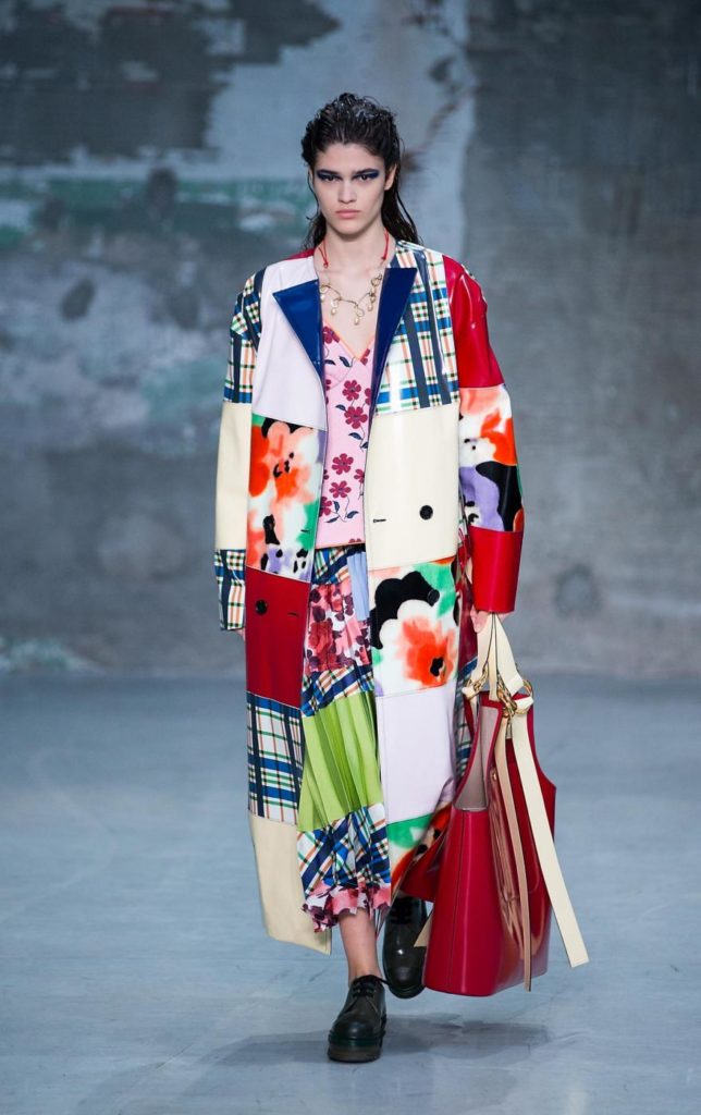 A sfilare sulla passerella di Marni sono pantaloni amplissimi e piccole sottovesti, tutto a creare un gioco di proporzioni. Il micro diventa macro, il maschile femminile ed è proprio lo scontro a creare l’armonia, è questo il mood della collezione Marni. In passerella ancora bustier dal tema floreale abbinati a gonne a campana, la vestaglia di visone patchwork e gli stivali da pioggia, il trench che riprende sempre un tema floreale che si ripropone in più outfit rimanendo perennemente presente nella collezone Marni per la primavera estate2018. Le calzature sono sopratutto stivali da pioggia con cui si creano stravaganti abbinamenti e scarpine pelose che non passano di certo inosservate. Gli accessori sono orecchini o collane dalle grandi dimensioni che nei ciondoli riprendono attraverso le pietre i colori degli abiti e del makeup, per un effetto giocoso.
