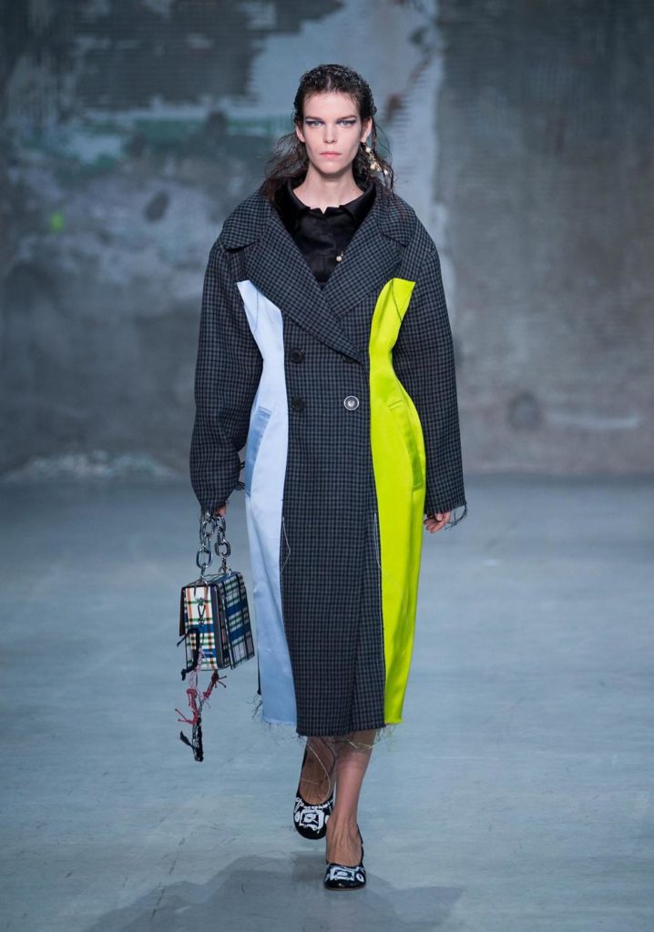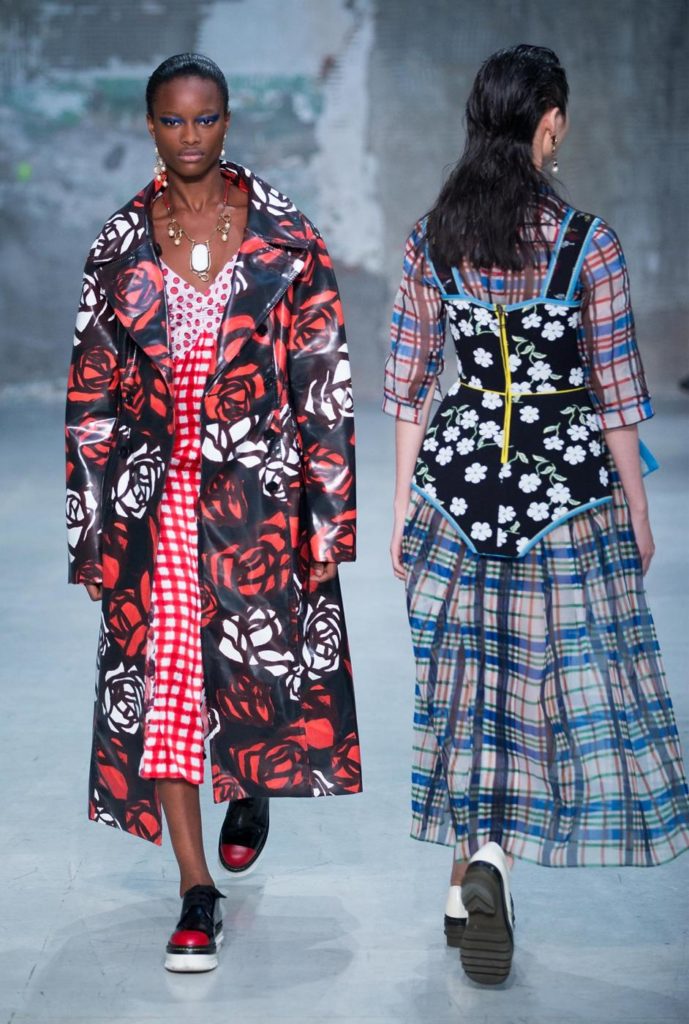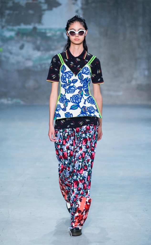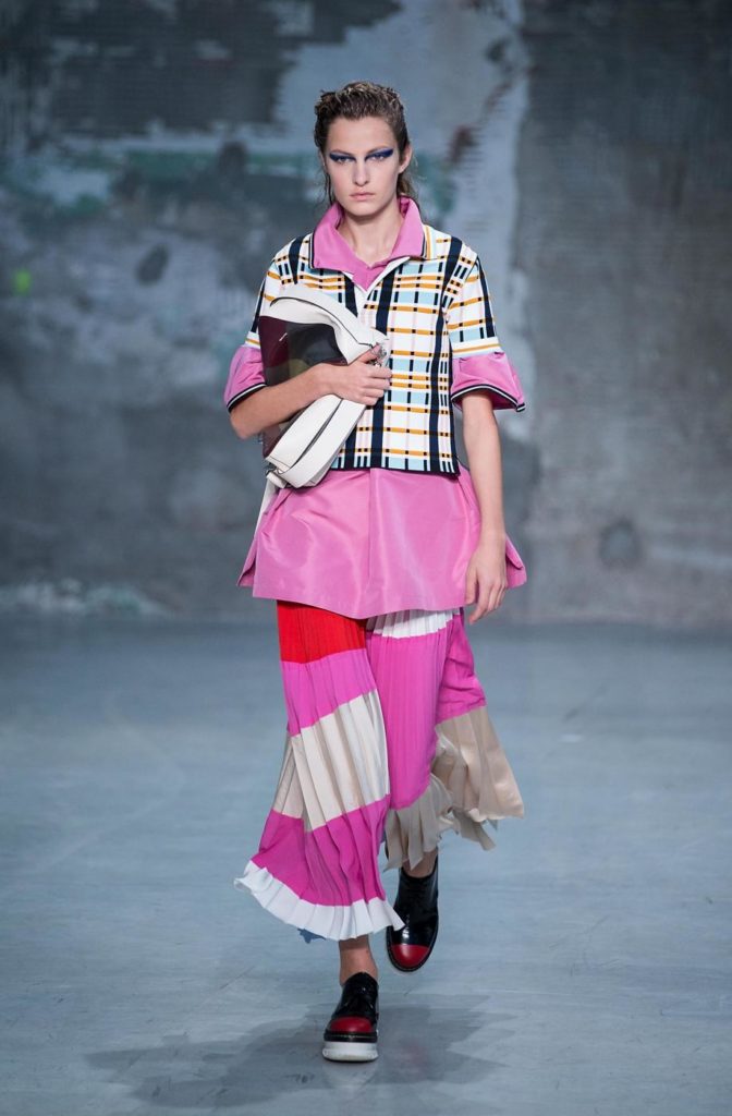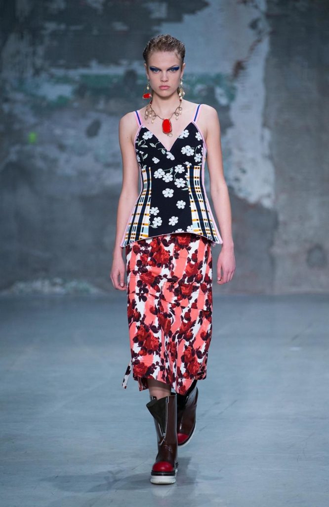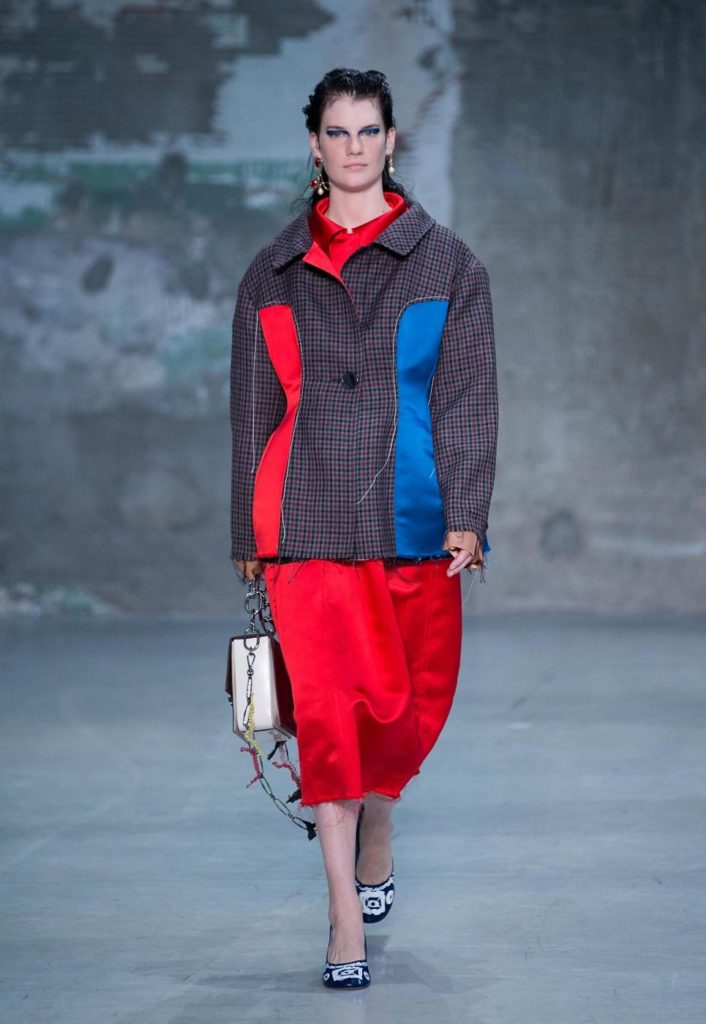 A sfilare sulla passerella di Marni sono pantaloni amplissimi e piccole sottovesti, tutto a creare un gioco di proporzioni. Il micro diventa macro, il maschile femminile ed è proprio lo scontro a creare l’armonia, è questo il mood della collezione Marni. In passerella ancora bustier dal tema floreale abbinati a gonne a campana, la vestaglia di visone patchwork e gli stivali da pioggia, il trench che riprende sempre un tema floreale che si ripropone in più outfit rimanendo perennemente presente nella collezone Marni per la primavera estate2018. Le calzature sono sopratutto stivali da pioggia con cui si creano stravaganti abbinamenti e scarpine pelose che non passano di certo inosservate. Gli accessori sono orecchini o collane dalle grandi dimensioni che nei ciondoli riprendono attraverso le pietre i colori degli abiti e del makeup, per un effetto giocoso.