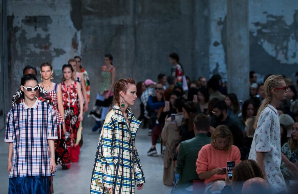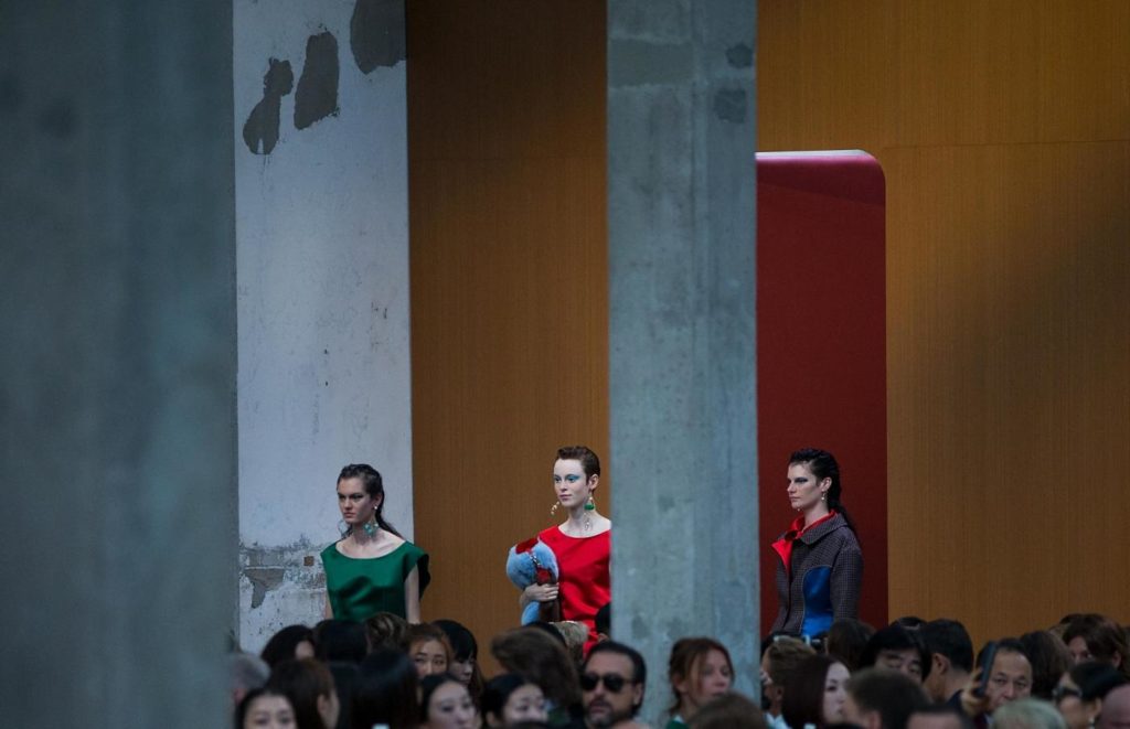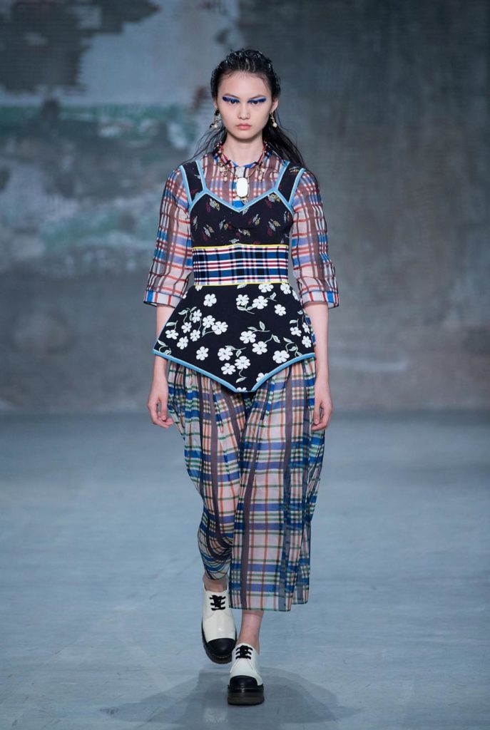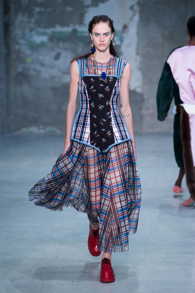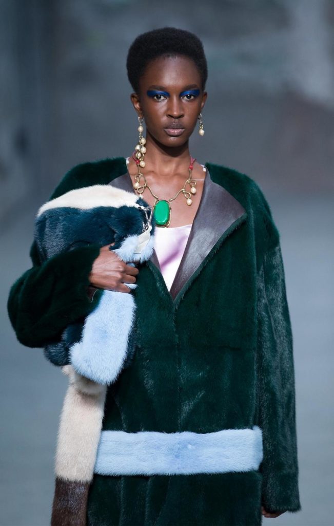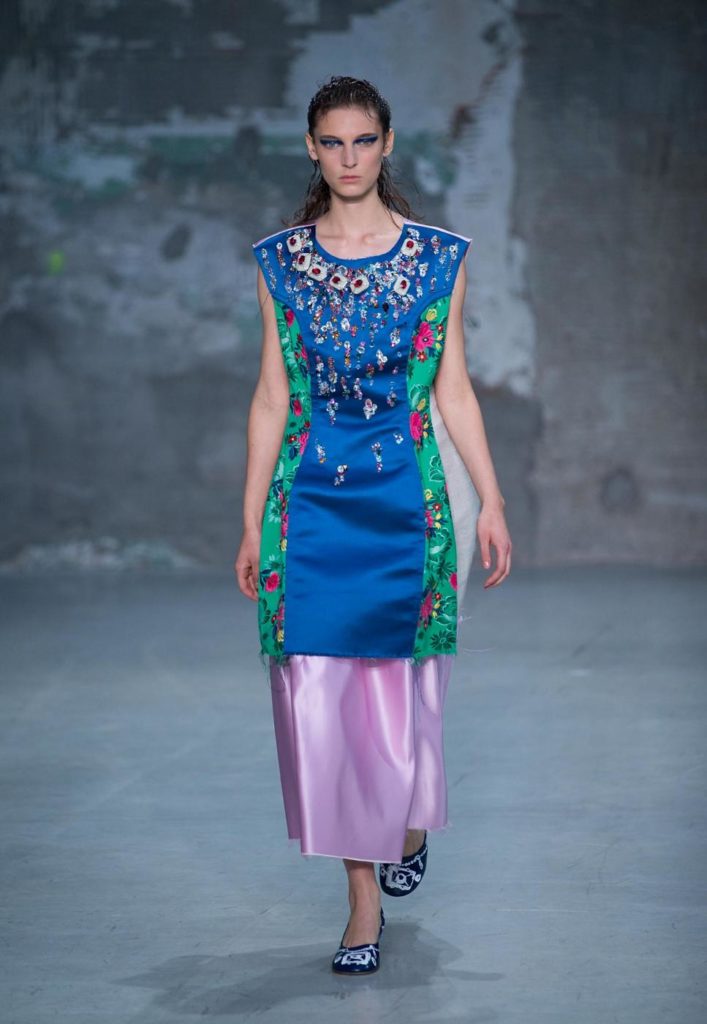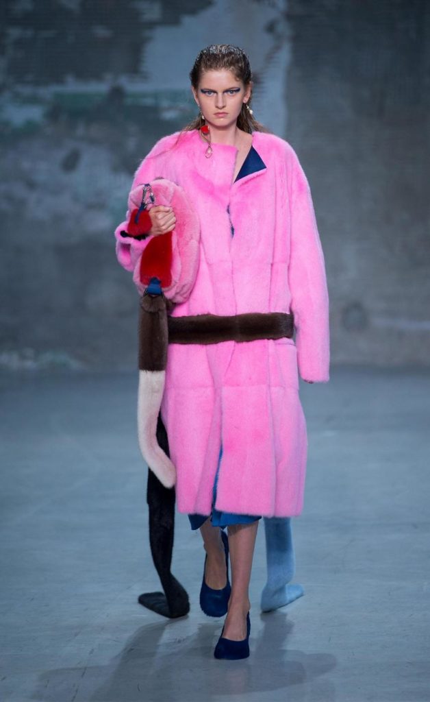 A sfilare sulla passerella di Marni sono pantaloni amplissimi e piccole sottovesti, tutto a creare un gioco di proporzioni. Il micro diventa macro, il maschile femminile ed è proprio lo scontro a creare l’armonia, è questo il mood della collezione Marni. In passerella ancora bustier dal tema floreale abbinati a gonne a campana, la vestaglia di visone patchwork e gli stivali da pioggia, il trench che riprende sempre un tema floreale che si ripropone in più outfit rimanendo perennemente presente nella collezone Marni per la primavera estate2018. Le calzature sono sopratutto stivali da pioggia con cui si creano stravaganti abbinamenti e scarpine pelose che non passano di certo inosservate. Gli accessori sono orecchini o collane dalle grandi dimensioni che nei ciondoli riprendono attraverso le pietre i colori degli abiti e del makeup, per un effetto giocoso.