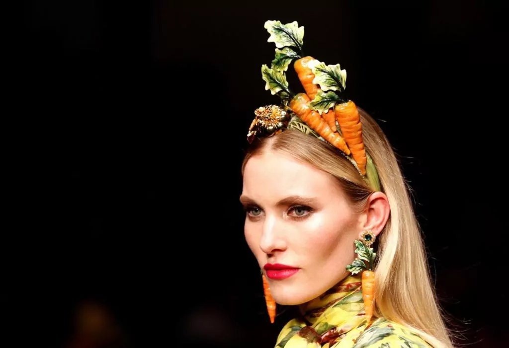 Il beauty look proposto nella collezione per la primavera estate 2018 prevede il focus sulla bocca con un rossetto rosso acceso, mentre sugli occhi si nota un filo di eyeliner e molto mascara ad accentuare lo sguardo, il viso rimane molto luminoso, rispettando il trend del momento che vede la luminosità come dettaglio di tendenza già da questa stagione. I capelli sono lasciati sciolti, mentre sulla testa coroncine con fiori, verdure colorate o carte da gioco, (a riprendere l’ispirazione della collezione), adornano la pettinatura.