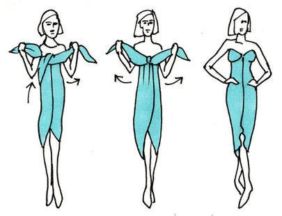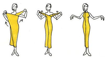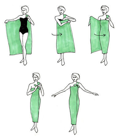 Ecco versione molto scenografica: l’abito con una sola spalla. Iniziate tenendo un’estremità di un maxi pareo sulla spalla sinistra, tirate il lembo destro sotto il braccio destro, passandolo dietro la schiena e poi sul davanti. Avvolgetevi e fermate con un nodo le due estremità sulla spalla sinistra. L’effetto fasciante e asimmetrico sarà davvero delizioso!