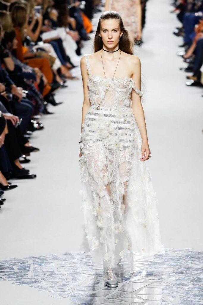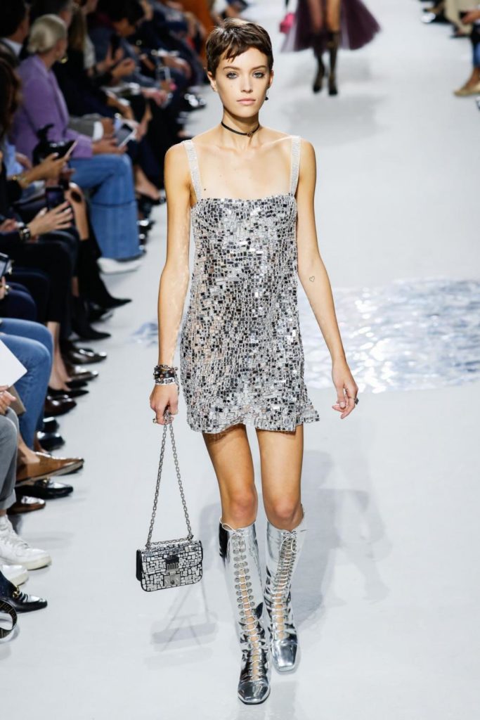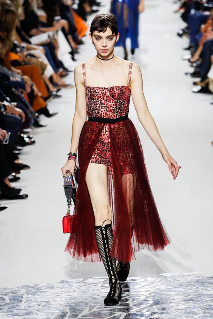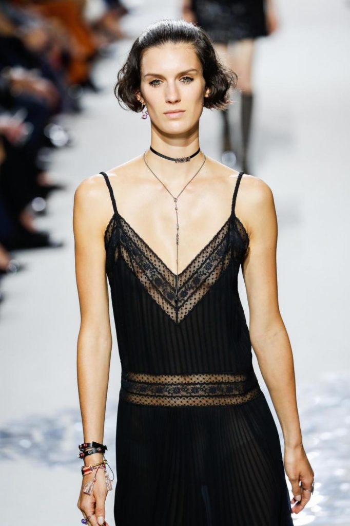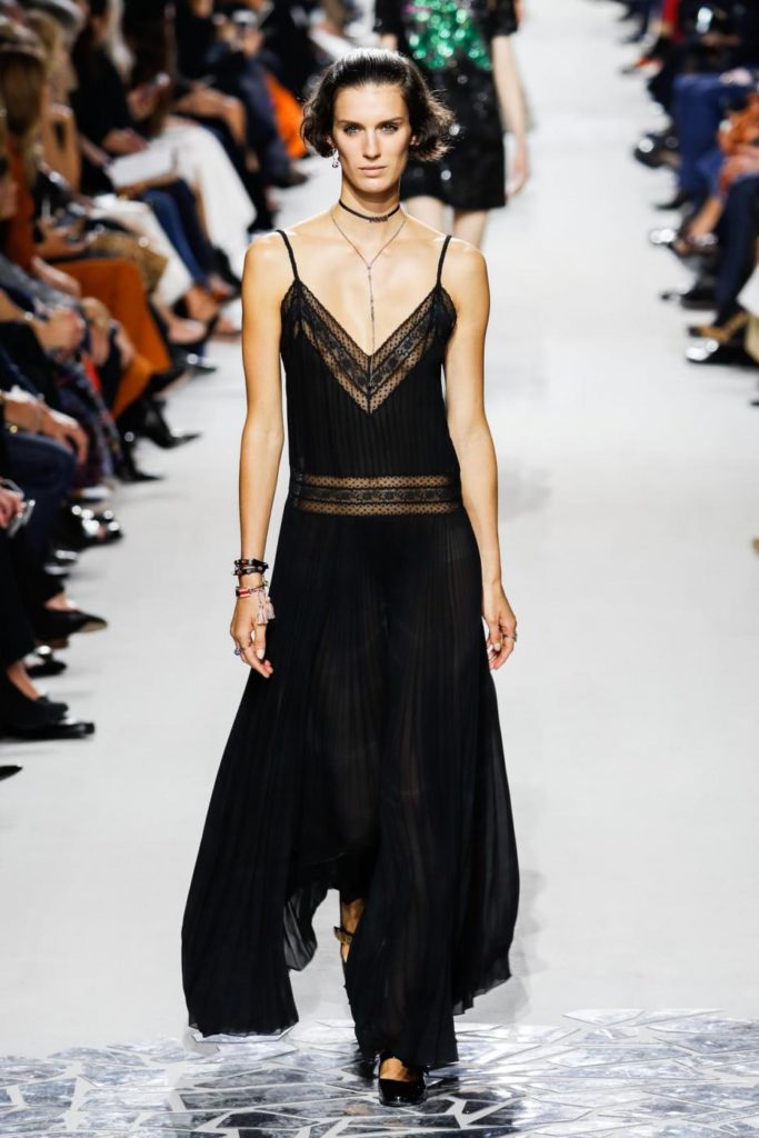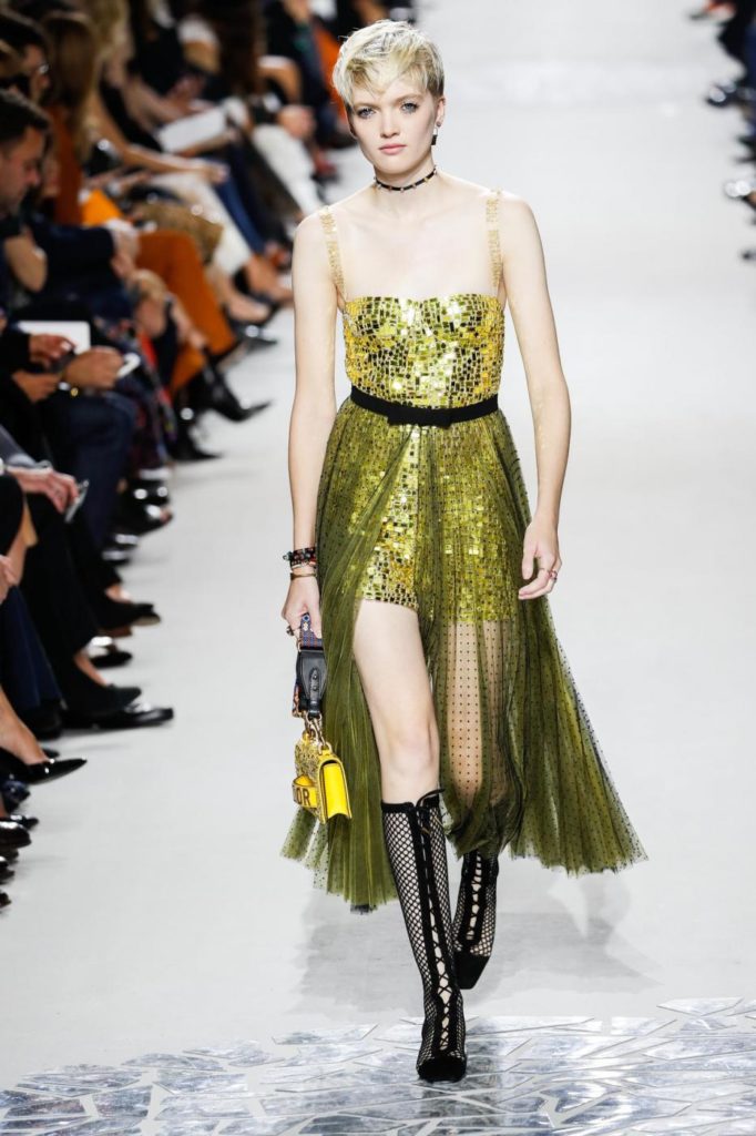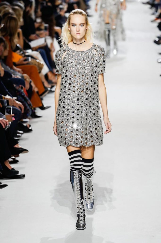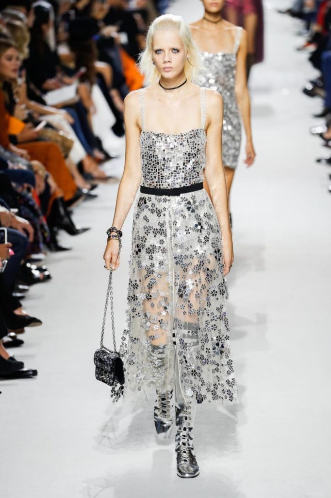 Per il giorno le proposte spaziano da uno stile più casual con jeans chiaro e maglietta a righe, berretto con visiera e ballerine a punta per arrivare a giacche doppiopetto, giacconi oversize, tailleur pantaloni, giacche di pelle multicolor da indossare con gonne in tulle trasparenti. Le proposte per la sera, vedono invece sfilare abiti in lamé o ricoperti da paillettes, dove i protagonisti sono diverse colorazioni, dal malva, al borgogna, al blu, fino al marrone e al giallo. Trasparenze e luccichi sono molto presenti nelle proposte serali dell’intera collezione per la primavera estate 2018.