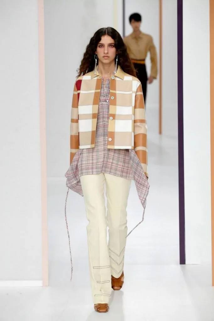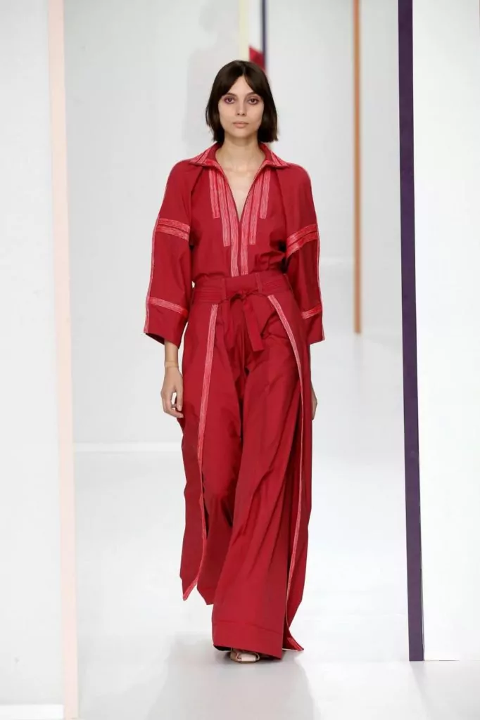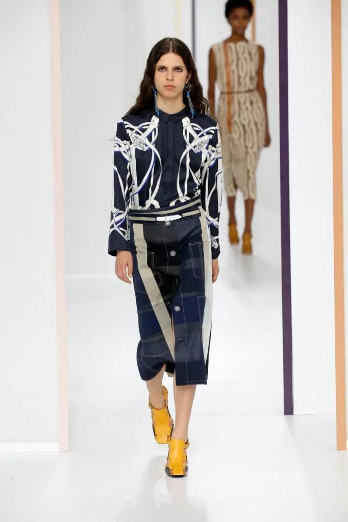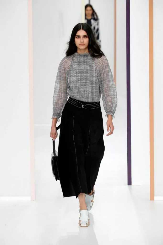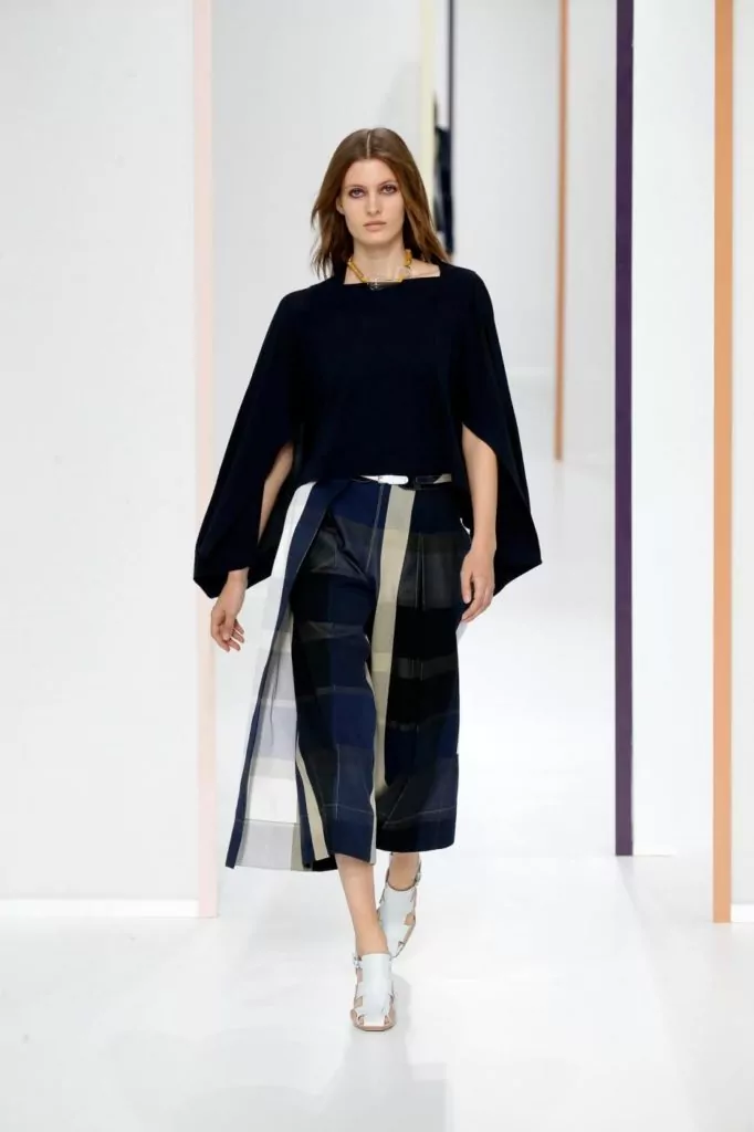E’ una collezione dall’eleganza sofisticata quella portata sulla passerella Hermes, dove sono nuance delicate a colorare gli abiti, come: verde, avorio, crema, beige, pesca, ma anche tonalità più forti come melanzana o bordeaux. Rimangono un must le mantelle, e a queste si uniscono ora anche abiti boho monocolore. Gli accessori vedono nella pelle il loro materiale principale e quindi vediamo così realizzati sia i sandali che le cartelle.