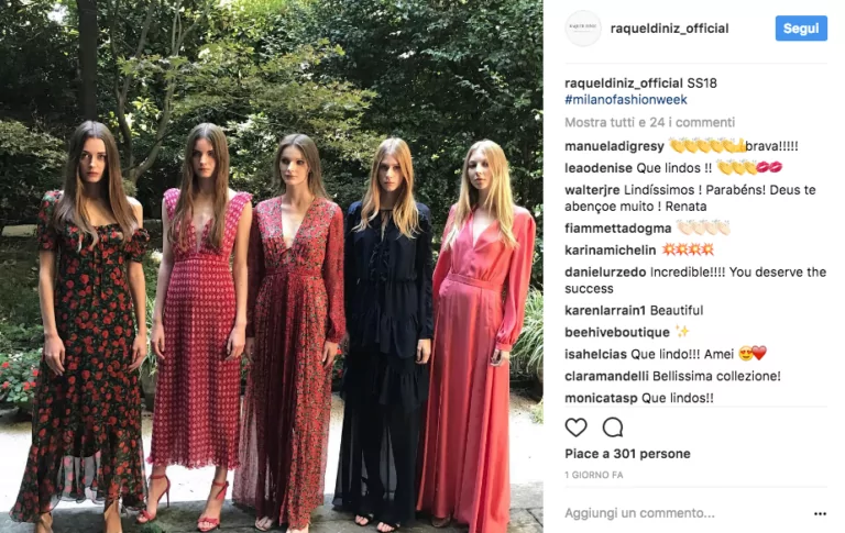 La collezione Raquel Diniz si distingue per un nuovo romanticismo e suggestioni anni Settanta, tra fiori multicolore sugli abiti, decorati con stampe geometriche o floreali. Tulipani su abiti di chiffon, micro fiori, righe sottilissime su gonne dalle forme fluide e top che lasciano le spalle scoperte, e poi ancora maxi dress su cui stampe che ritraggono fiori sono ancora le protagoniste, attraverso le grandi rose proposte su di essi. E’ una grande sensualità quella che traspare da abiti in chiffon plissettato, tutti con un elegante taglio a impero che allunga la silhouette, e dalle tonalità di rosso rubino, blu notte e verde bosco.