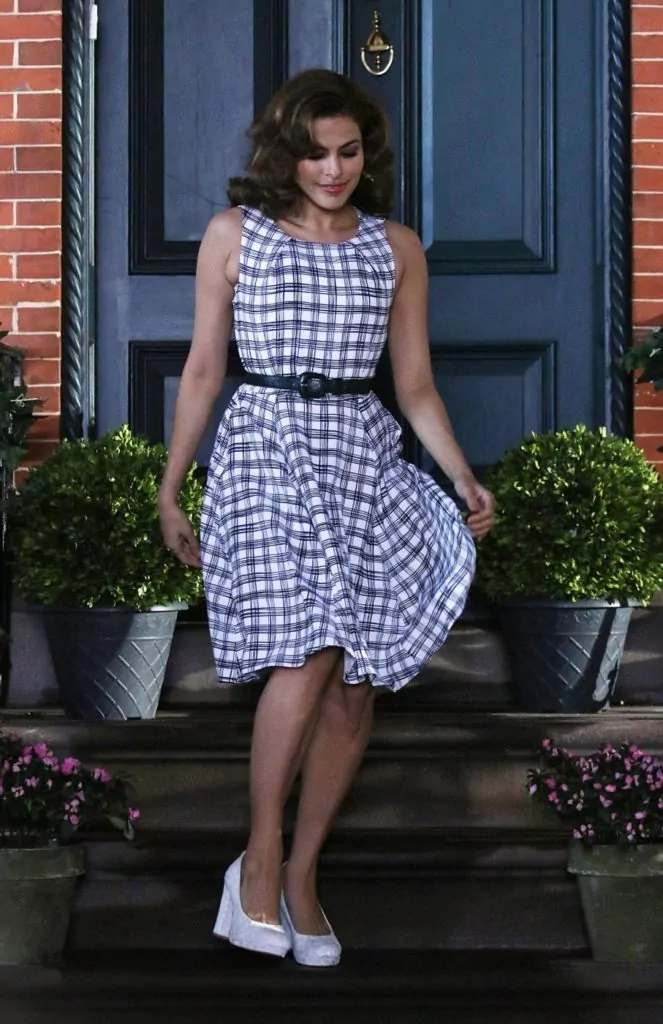 Scatti rubati dal set dello shooting fotografico per la nuova campagna pubblicitaria di un noto marchio di moda statunitense che vede protagonista la bellissima attrice Eva Mendes in un fresco ed elegante stile anni 50′. Dopo averla vista in altre pubblicità più sexy, come quella di Calvin Klein di qualche anno fa, che la vedeva in pose bollenti, eccola ora ritratta in un ritorno allo stile ed al decoro. La pubblicità Calvin Klein era stata addirittura vietato dalla televisione inglese; le immagini infatti turbarono l’opinione pubblica. L’attrice appariva in reggiseno e slip, completamente ricoperta da una crema con un effetto oliato e con i capelli bagnati. Un mix bollente che ritraeva la Mendes in un look giudicato da alcuni fin troppo caldo.