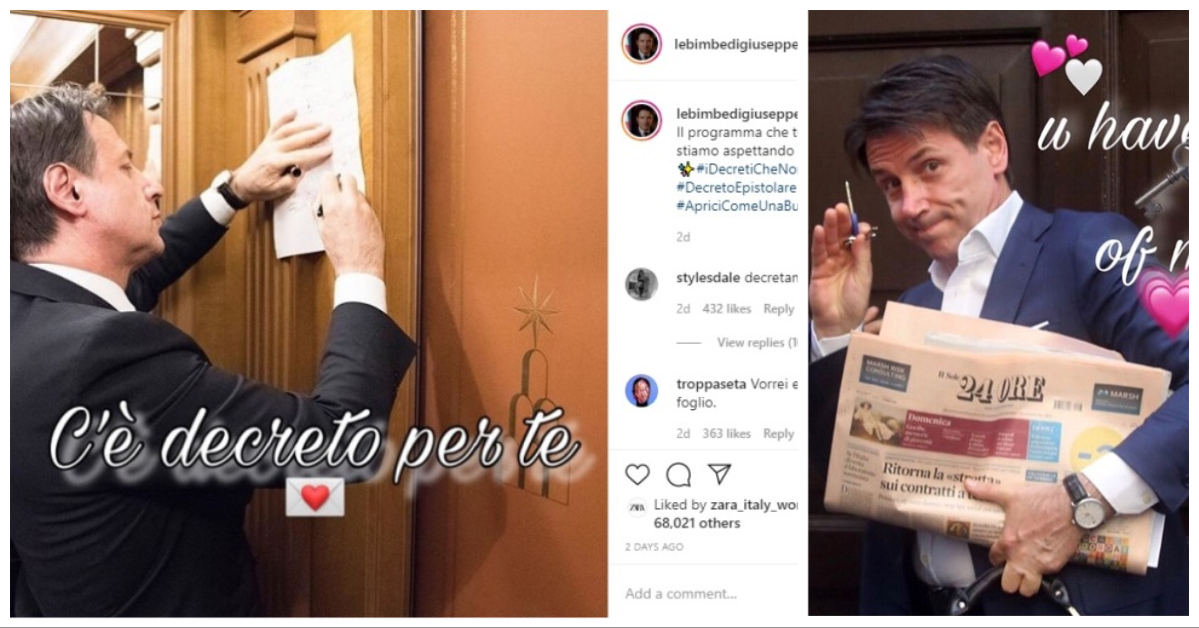 La sua dichiarazione “Rimaniamo distanti oggi per abbracciarci con più calore e per correre insieme più veloci domani. Ce la faremo”, in poco tempo è diventata la frase trend più digitata sui social di tutto il paese. Charme, sex appeal e fermezza, hanno decretato la buona riuscita del discorso del premier che ha visto aumentare l’indice di gradimento sia a livello personale che dell’operato del governo. È qui, che in piena quarantena, sui social è esplosa la Giuseppe Conte mania. Su instagram con la Fanpage “Le bimbe di Giuseppe Conte”, gli è stata riservata un’intera pagina, che in breve tempo ha visto aumentare a dismisura il numero di follower e specialmente di like.