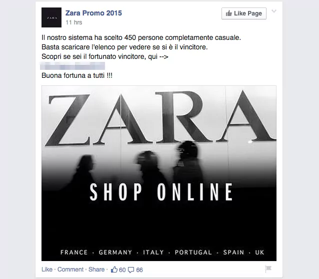 Per alcuni amanti dello shopping è sembrato un Babbo Natale arrivato in ritardo e invece il concorso evento indetto su facebook dalla pagina 2015_Promozione_ Zara , che ha totalizzato 21.000 like in poche ore, è una grossa Bufala. La pagina indica come partecipare al concorso attraverso tre semplici istruzioni: Mettere un like, invitare cinque amici e in ultimo lasciando un commento con scritto “Grazie Zara”. Fissata per giorno 14 la fantomatica estrazione, del tutto casuale, dei 400 “fortunati” che avrebbero potuto spendere €500 presso tutti i negozi della famosa catena.