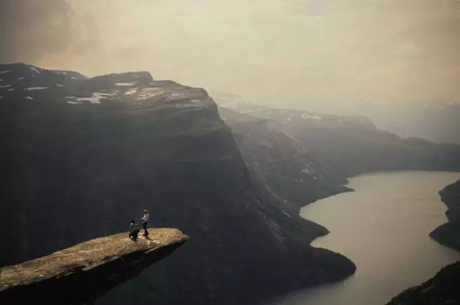 Il 21 enne belga Harald Six ha chiesto alla sua fidanzata Hanna di sposarlo nel momento perfetto. Lo ha fatto durante un viaggio in Norvegia, esattamente mentre si trovavano sospesi a 700 metri d’altezza sulla Trolltunga, la celebre roccia che affaccia sul lago Ringedalsvatnet. Una proposta di matrimonio memorabile che tutti sognerebbero.